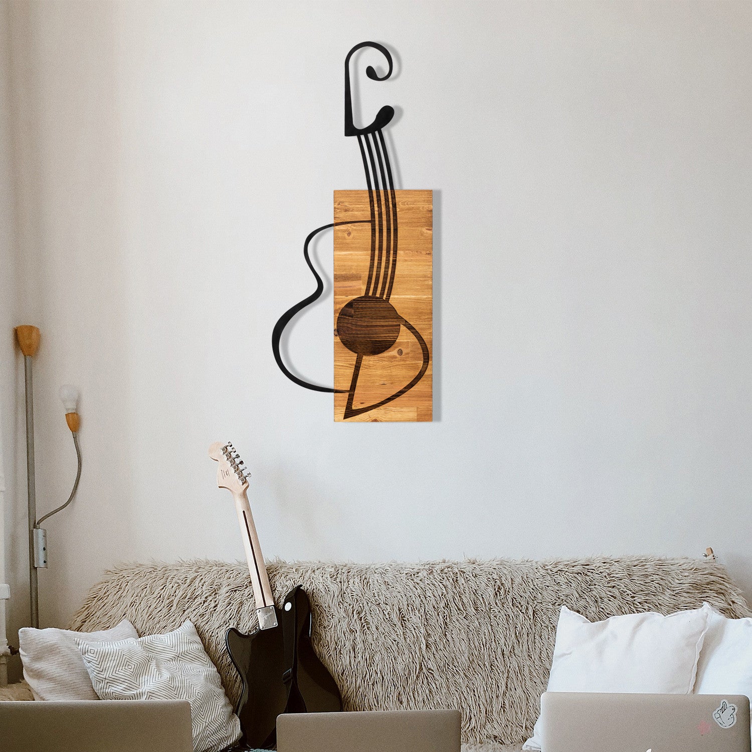 Gitar — Acessório Decorativo de Parede em Metal com Moldura de Madeira, Preto/Nogueira, 39 x 13 cm