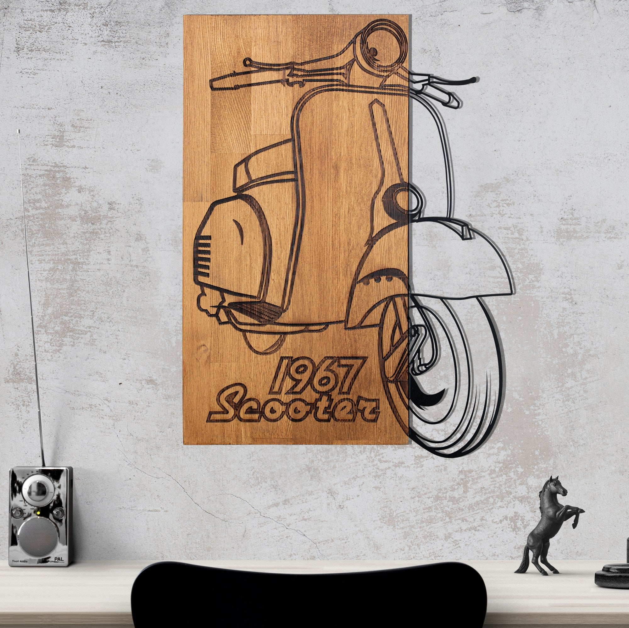 Scooter Nostálgica — Acessório Decorativo de Parede em Metal Preto com Moldura em Nogueira, 44 x 59,5 cm