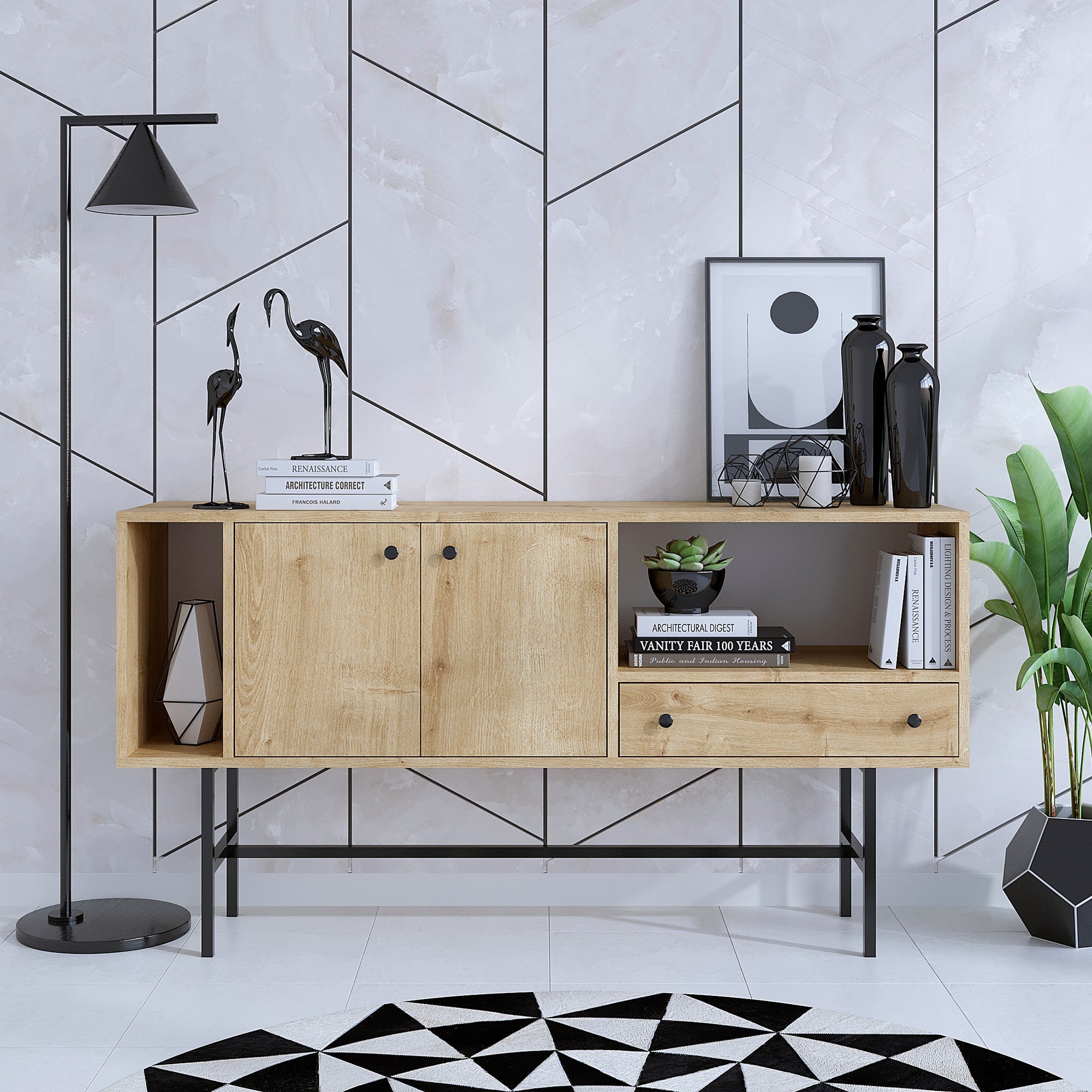 Aparador – 140cm x 40cm x 89cm – Carvalho e Preto – Painel de partículas revestido a melamina e Pernas de madeira