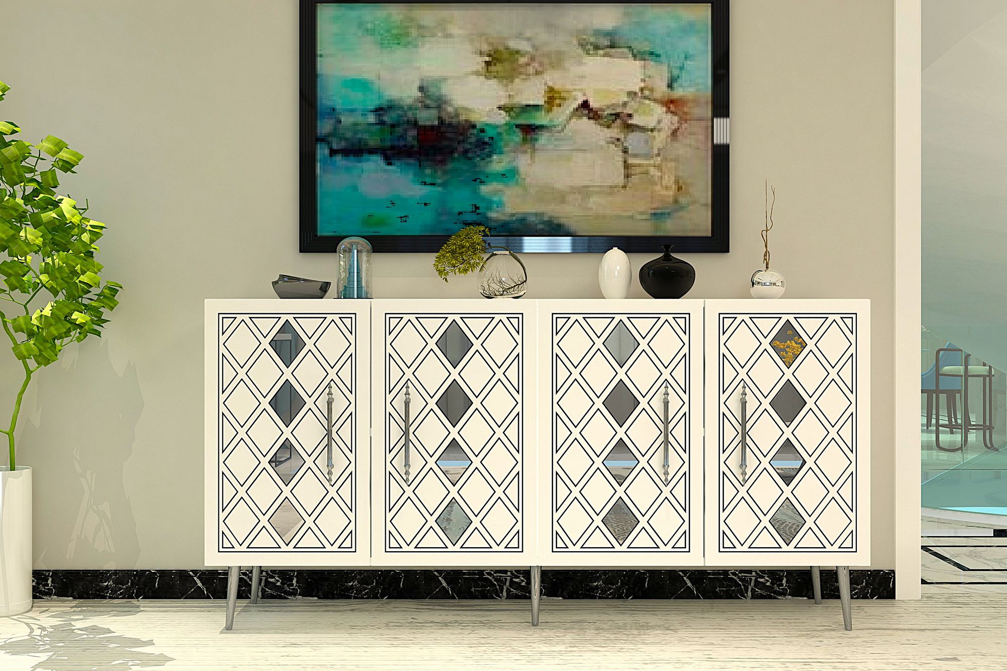 Aparador de MDF – 120 cm – Branco, Mármore de Éfeso, Prata