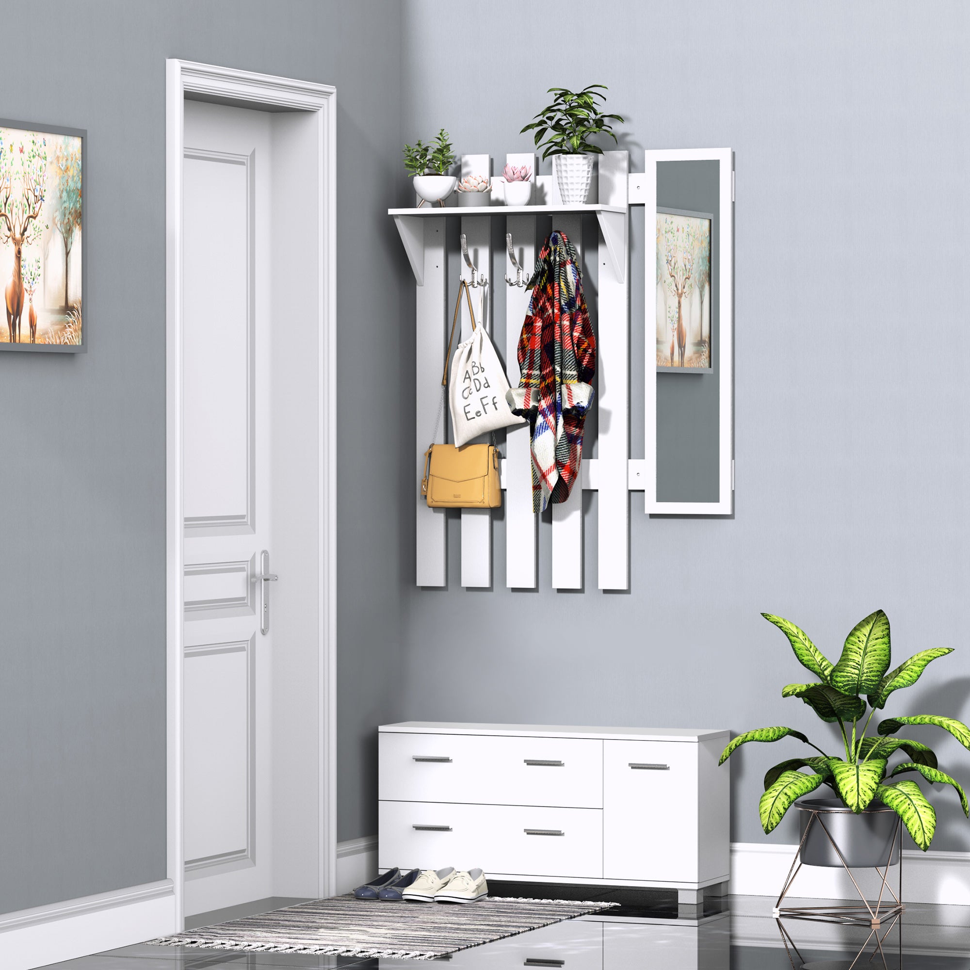 Suporte de hall escandinavo com cabideiro e prateleiras – 64,7 x 80 x 3,6 cm – Branco – Painel de partículas revestido de melamina