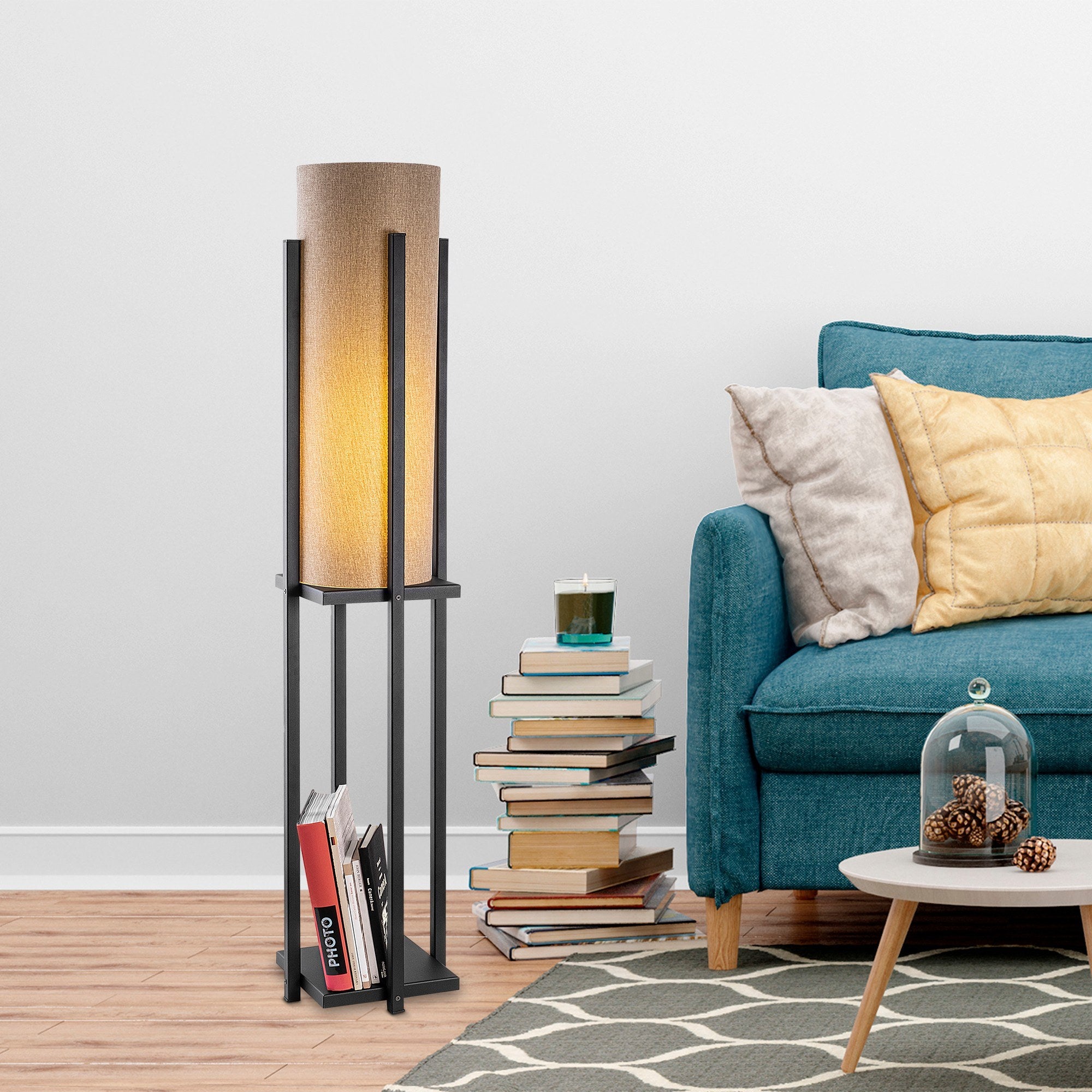Candeeiro de Pé com Estante de Madeira de 3 Níveis para Decoração de Sala e Quarto Preto 160 x 26 x 26 cm