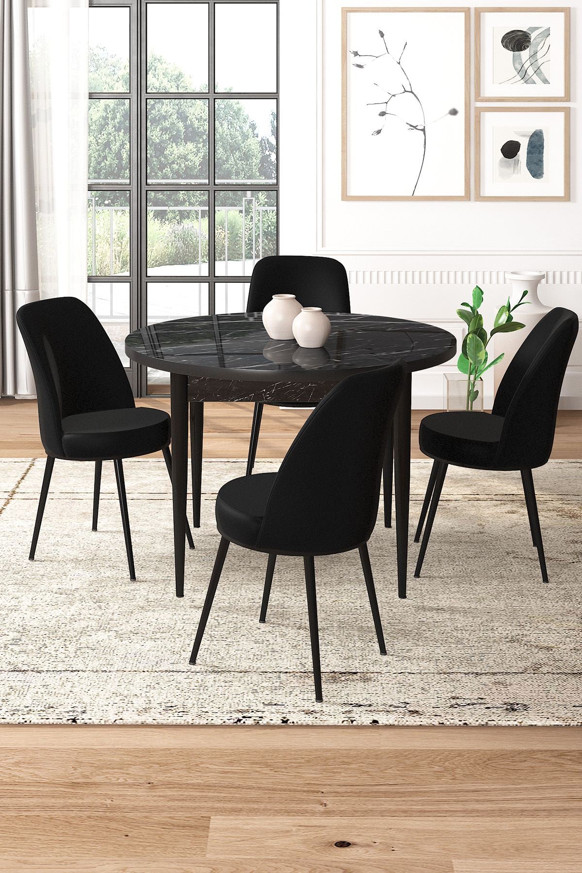 Conjunto de Mesa de Jantar Extensível e Cadeiras - 114x78x70cm - Mármore Preto e Cinza - MDF e Metal