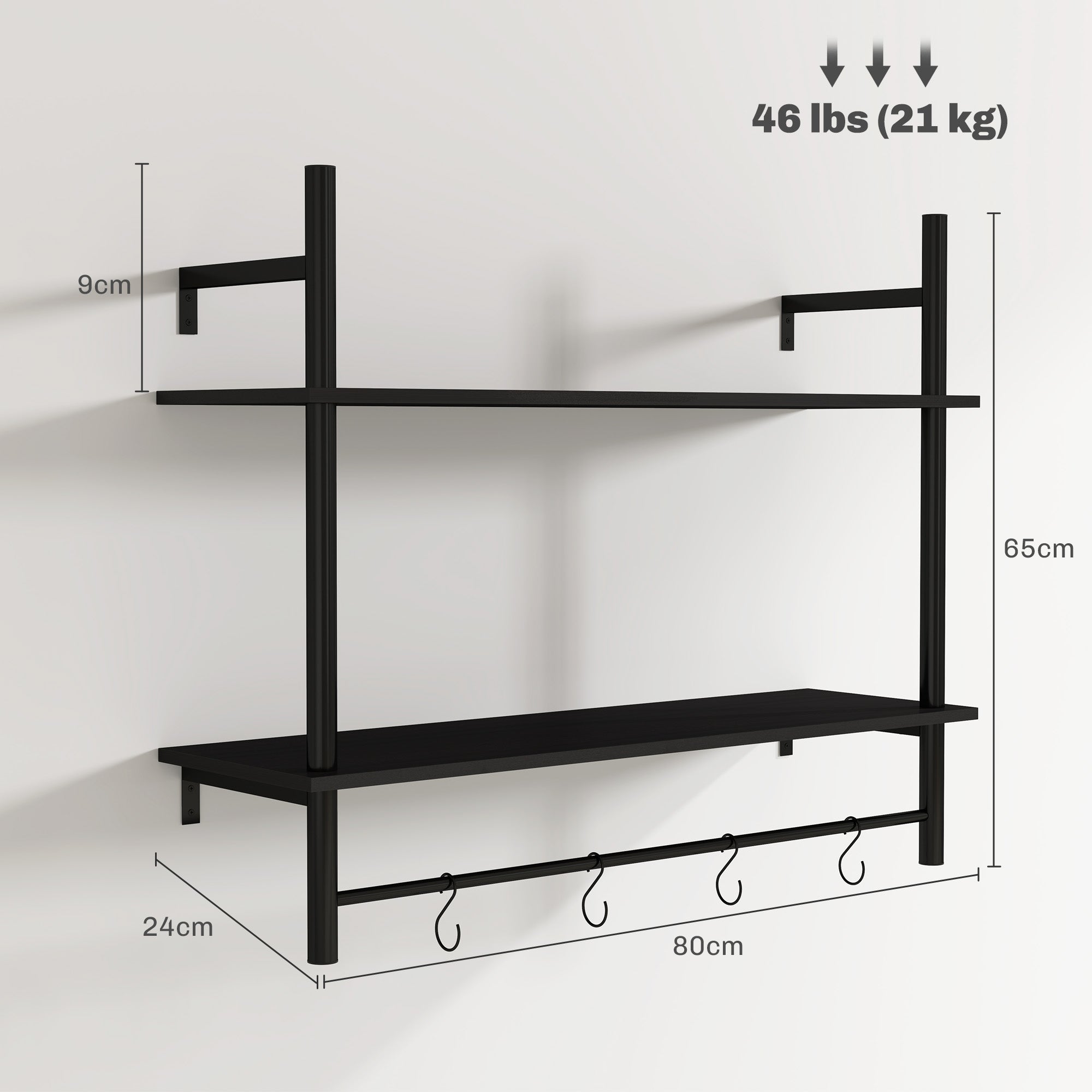 Estante de Parede de 2 Níveis com 4 Ganchos – 80x24x65 cm – Cor Preto – Melamina e Aço