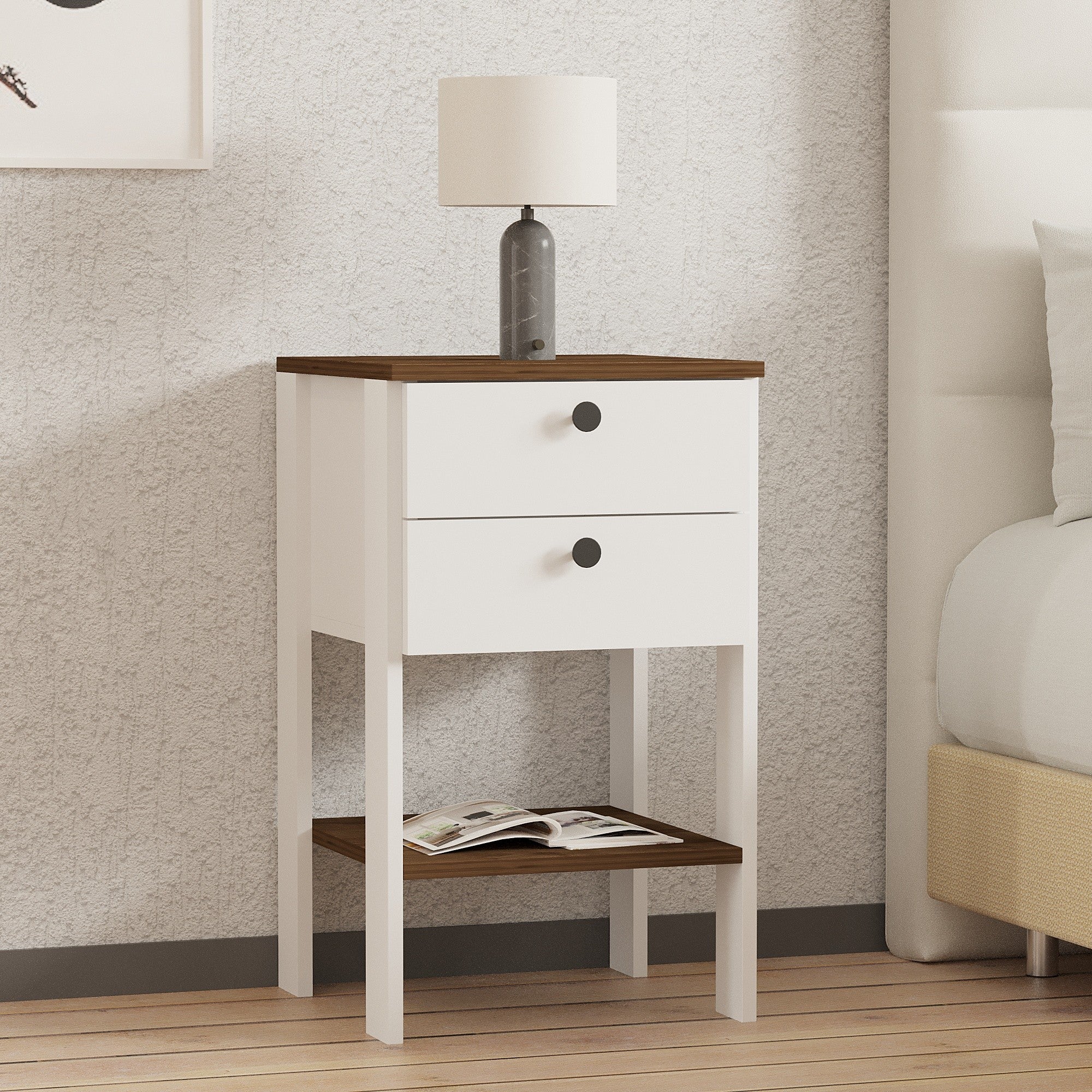 Mesa de Cabeceira Escandinava – 44 x 75 x 44 cm – Branca e Nogueira – Painel de Partículas