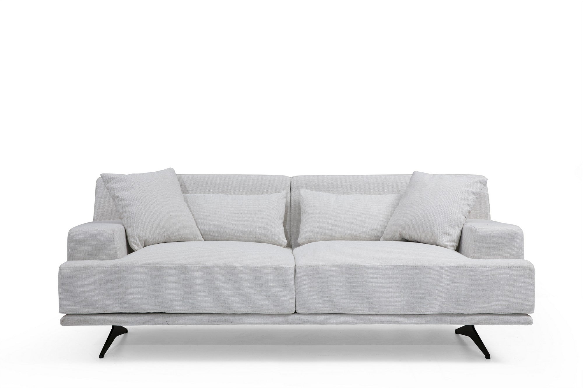 Sofá elegante de 3 lugares, branco, 230 cm | Estrutura em madeira de faia e aglomerado, tecido 100% poliéster | Encosto em espuma cinza macia e silicone, inclui 2 almofadas