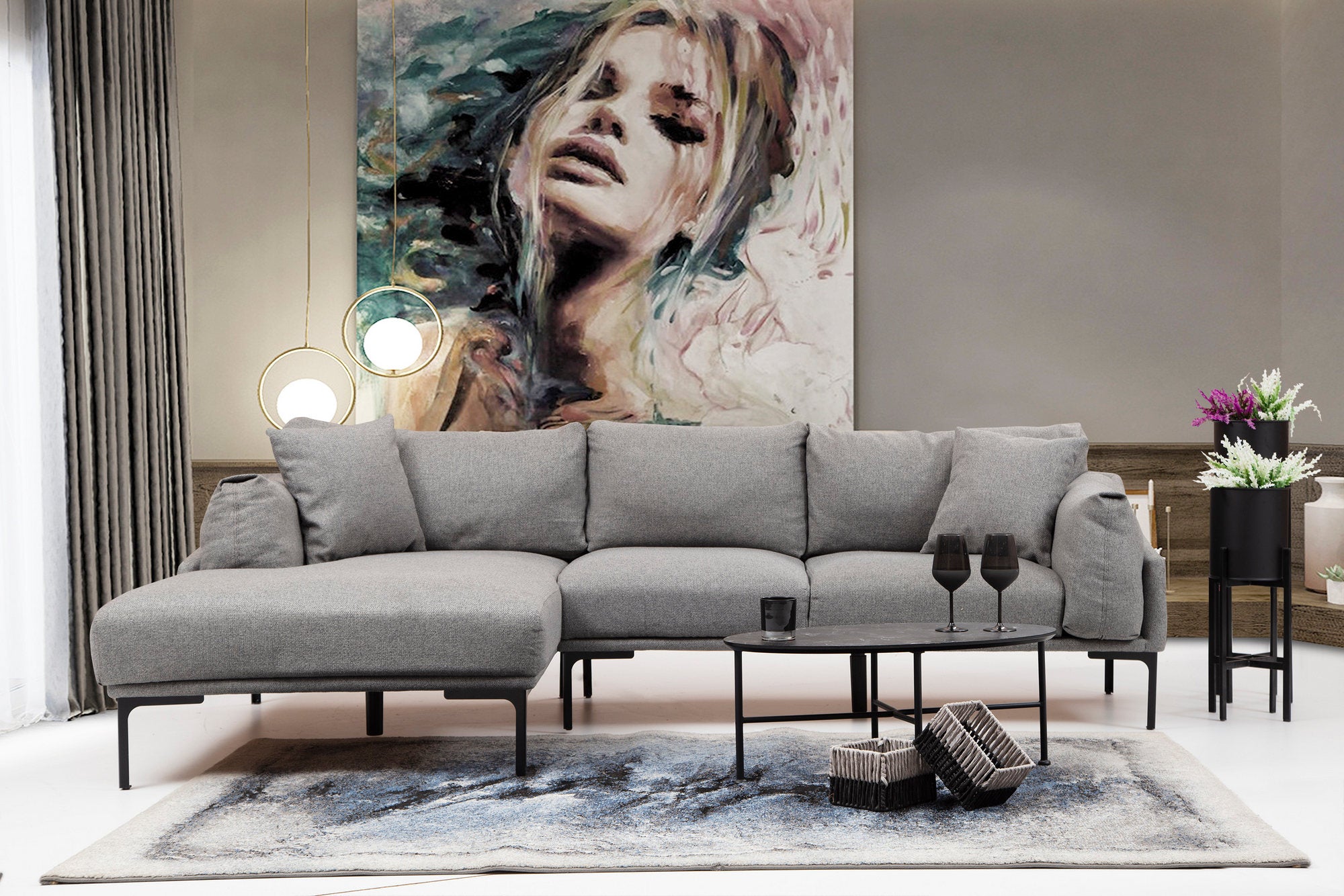 Sofá de canto elegante, cinza, 255 x 150 cm | Estrutura em madeira de faia e aglomerado, tecido 100% poliéster | Inclui 2 almofadas, pernas de metal | Design escandinavo moderno