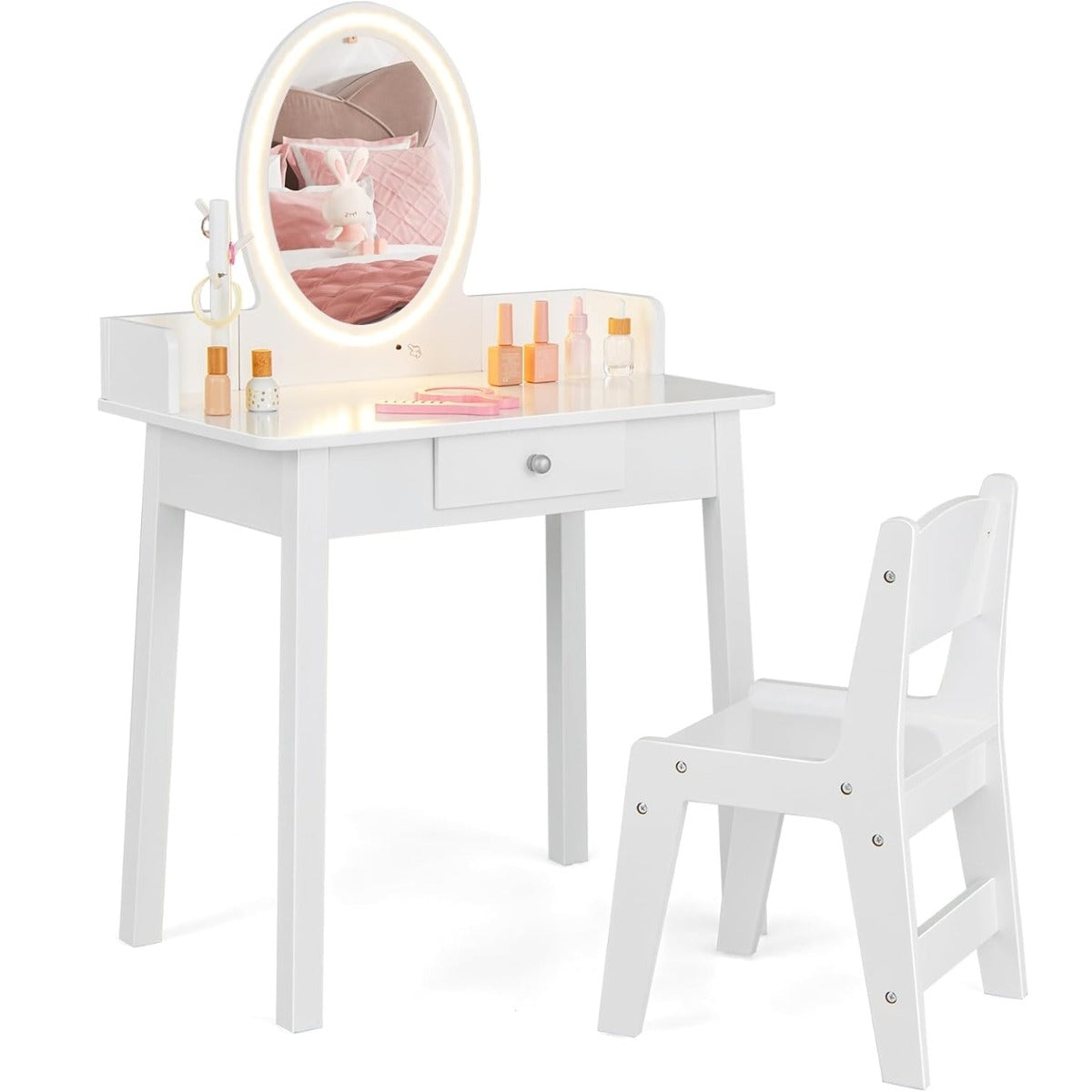 Toucador Infantil Branco com Espelho Iluminado, Banqueta, Gaveta e Organizador de Joias para Meninas