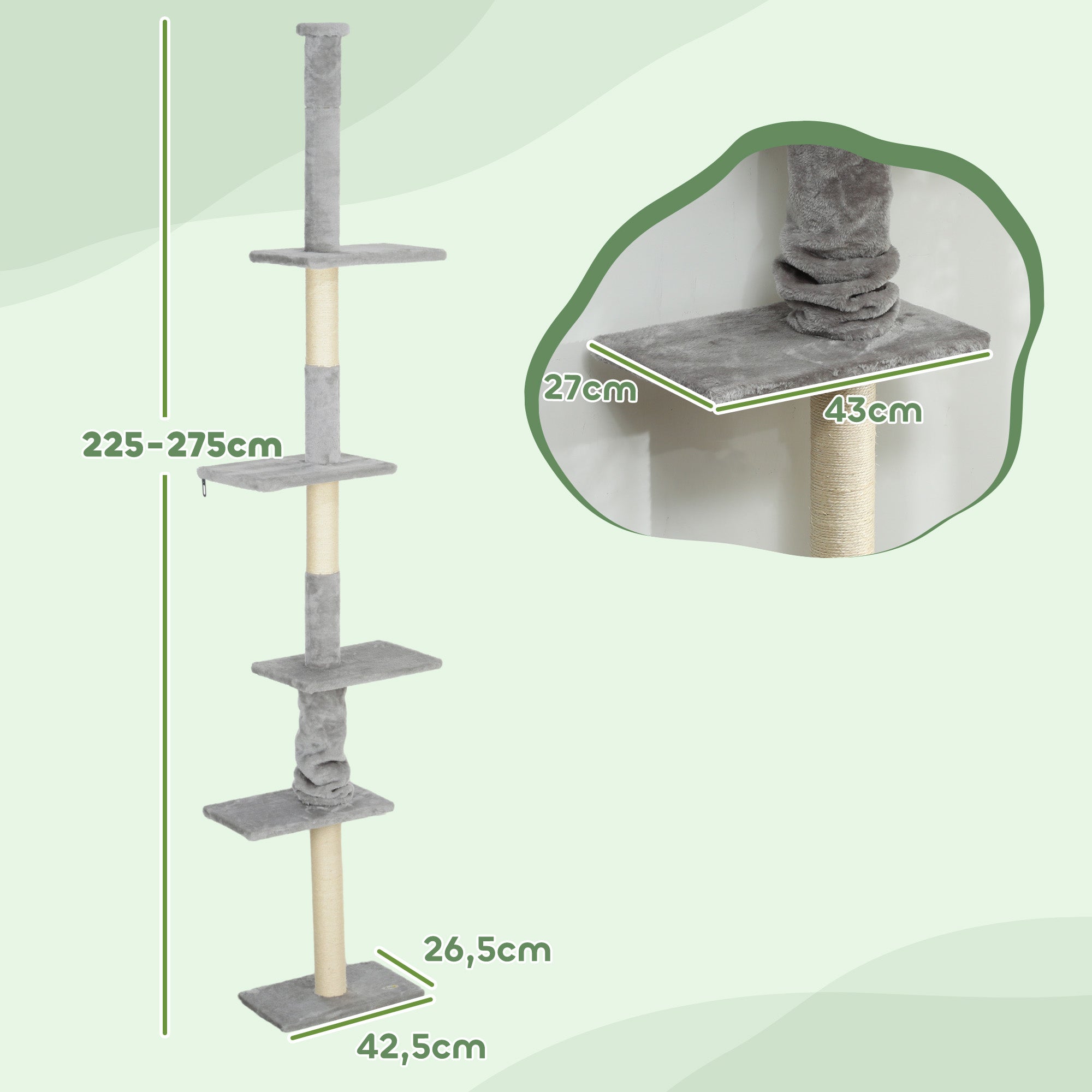 Arranhador para Gatos Chão ao Teto – 43x27x228-260 cm – Cinzento – Aglomerado de Madeira, Felpa e Sisal