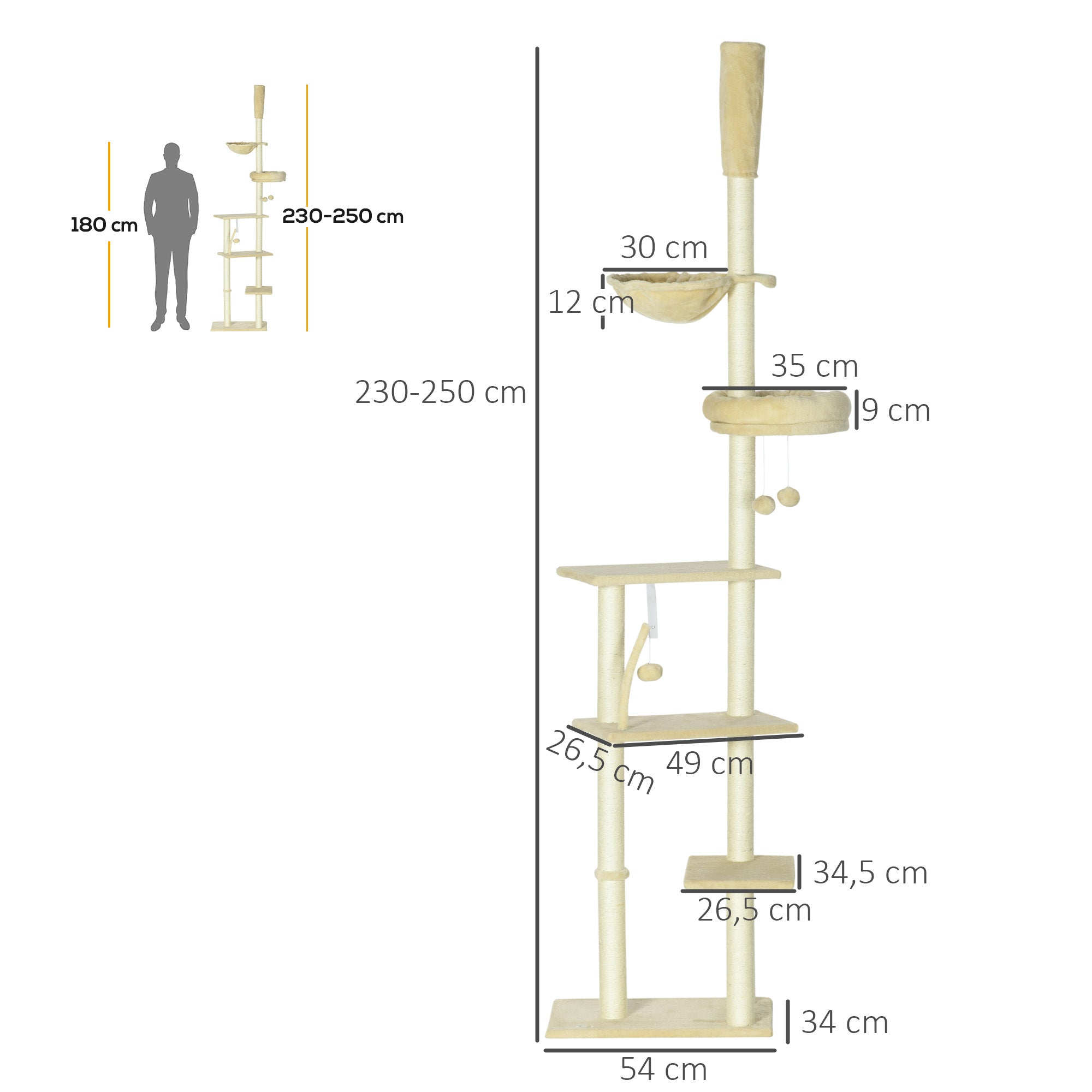 Arranhador para Gatos Bege 54x34x230-250 cm com Altura Ajustável e Múltiplas Plataformas