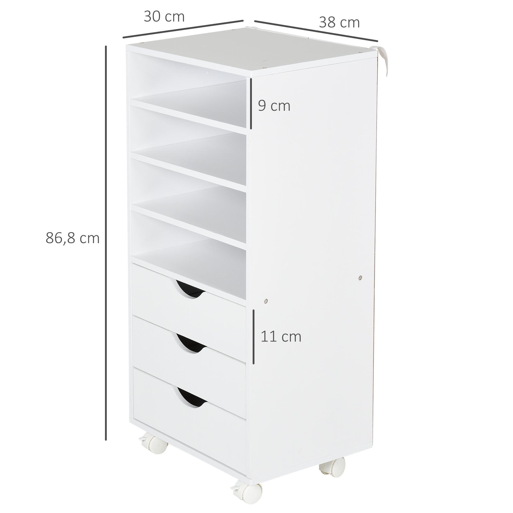 Móvel Auxiliar de Escritório com 3 Gavetas e 4 Prateleiras - 40x30x83 cm - Branco