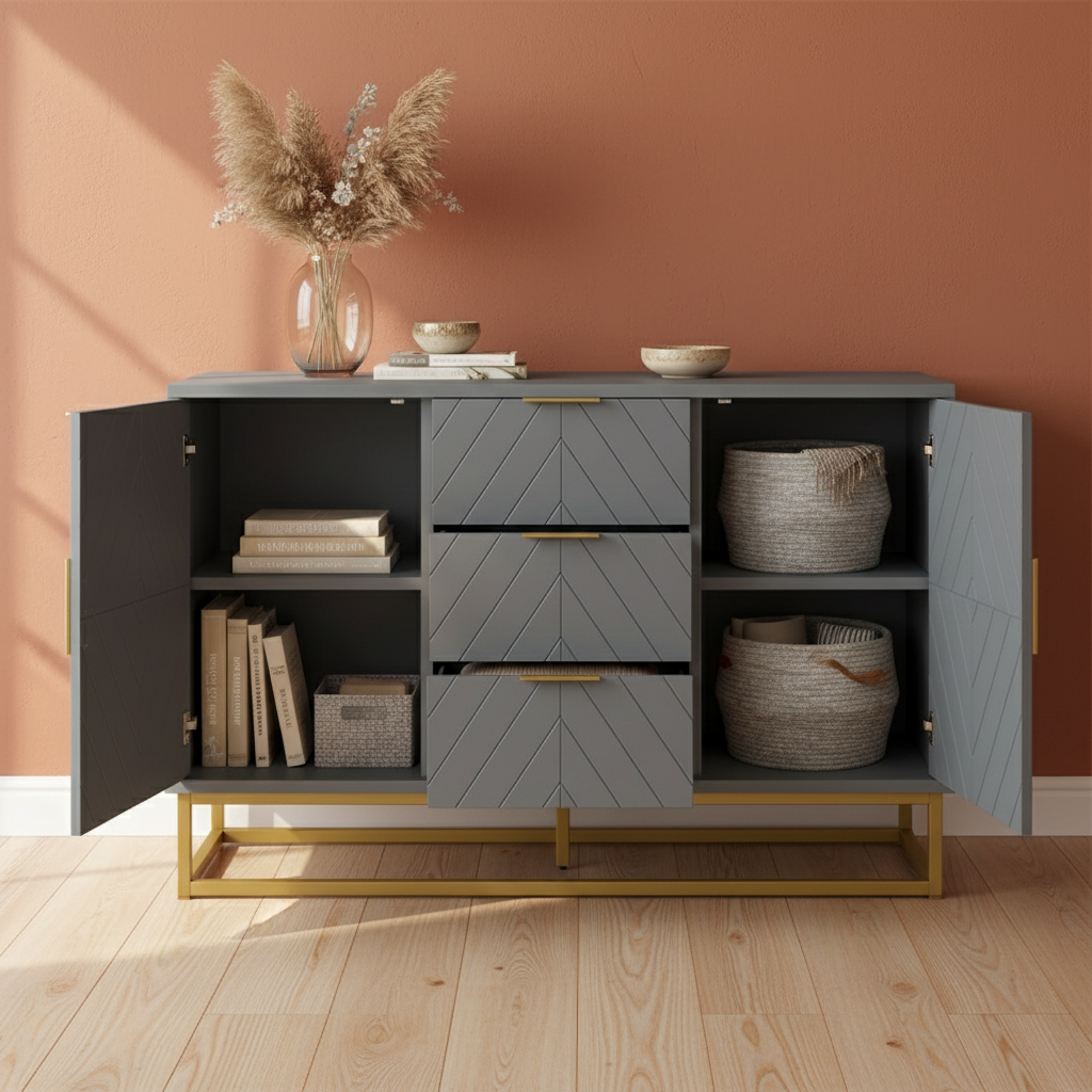 Aparador Auxiliar com 3 Gavetas e 2 Armários – 120x40x76 cm – Cinza – MDF e metal