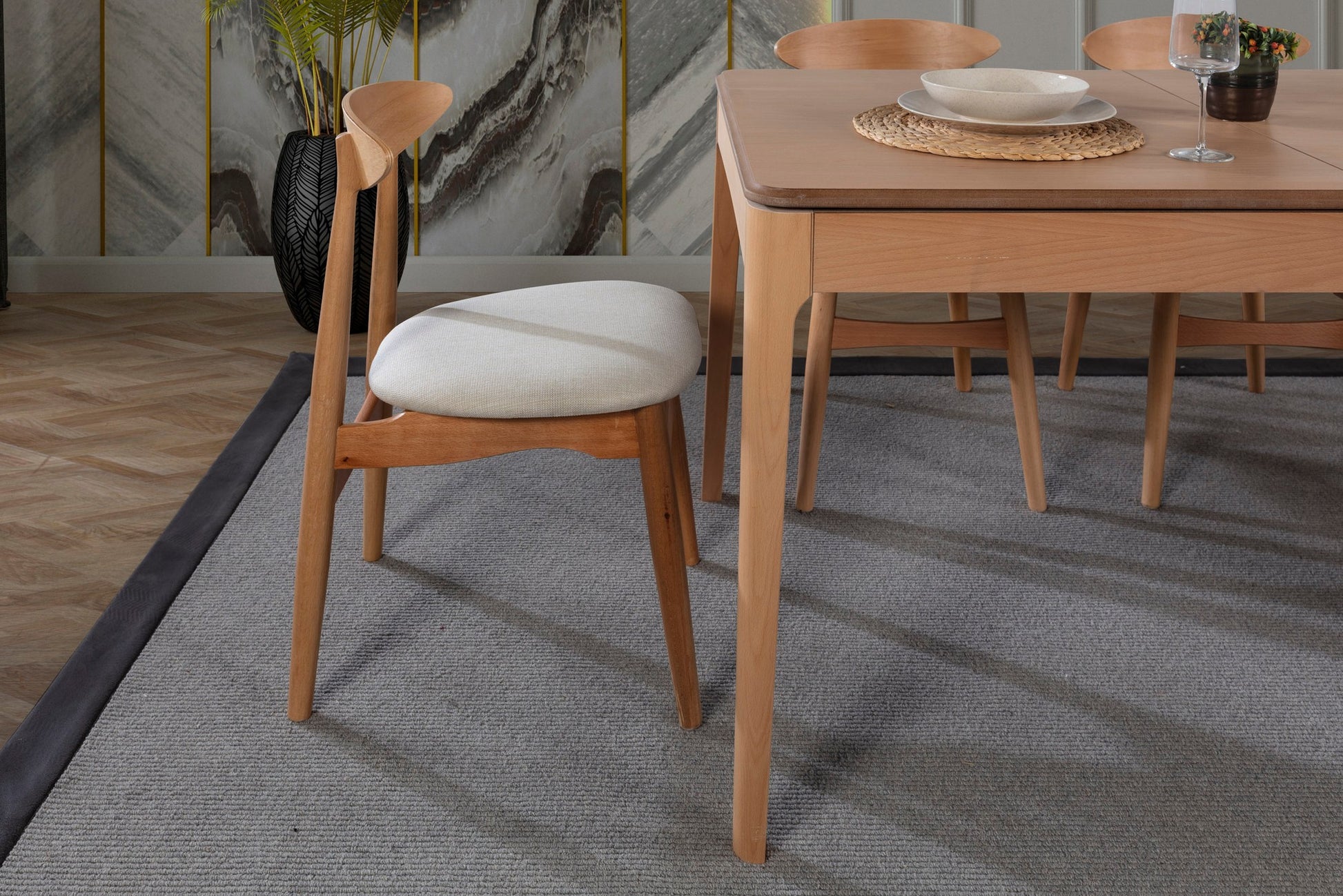 O nosso conjunto de mesa de jantar e cadeiras é feito de madeira 100% faia, conhecida pela sua durabilidade e beleza natural. Os tons quentes e os ricos padrões de grão da madeira darão instantaneamente um toque de sofisticação ao seu espaço de refeições.