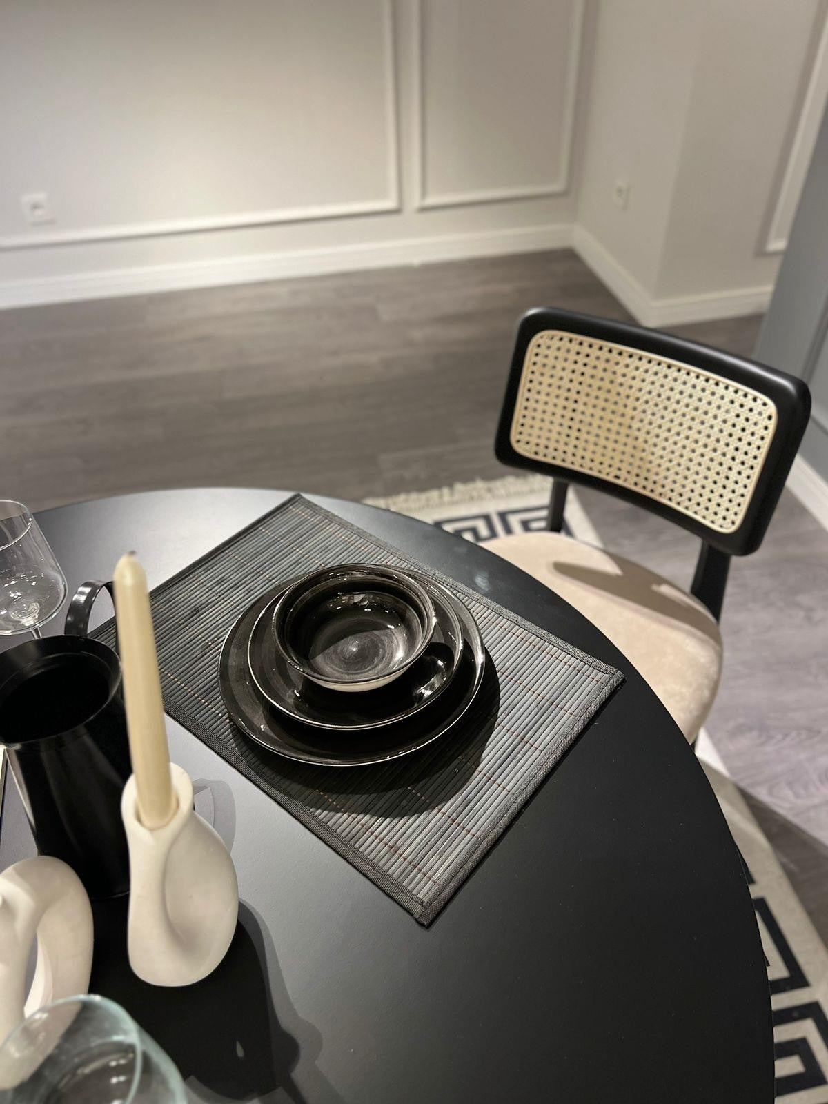 A combinação das cores preto e branco neste conjunto cria um contraste impressionante que dá um toque de elegância a qualquer espaço de refeições. O design elegante e moderno combina facilmente com qualquer decoração interior, tornando-o um complemento perfeito para a sua casa.