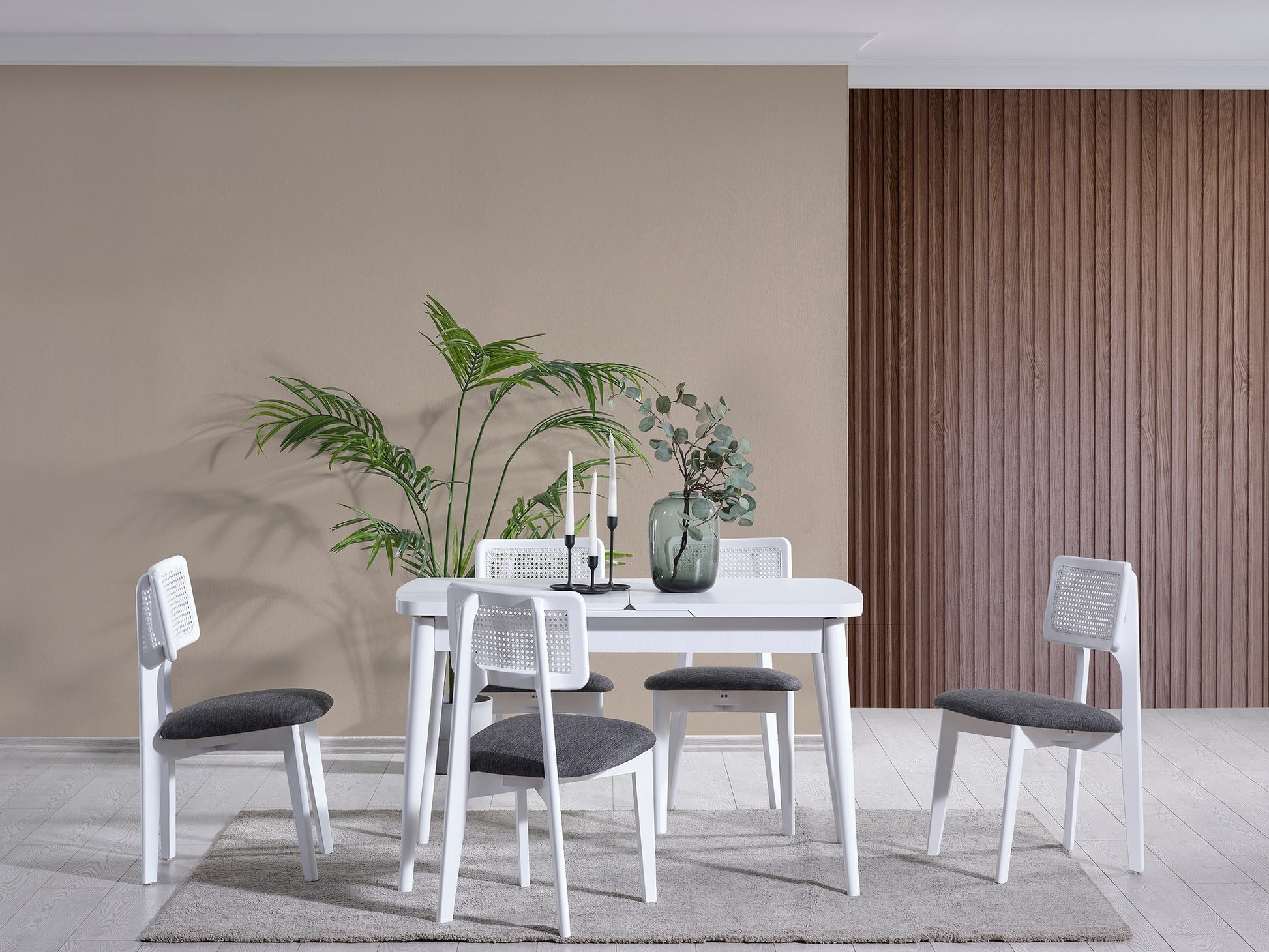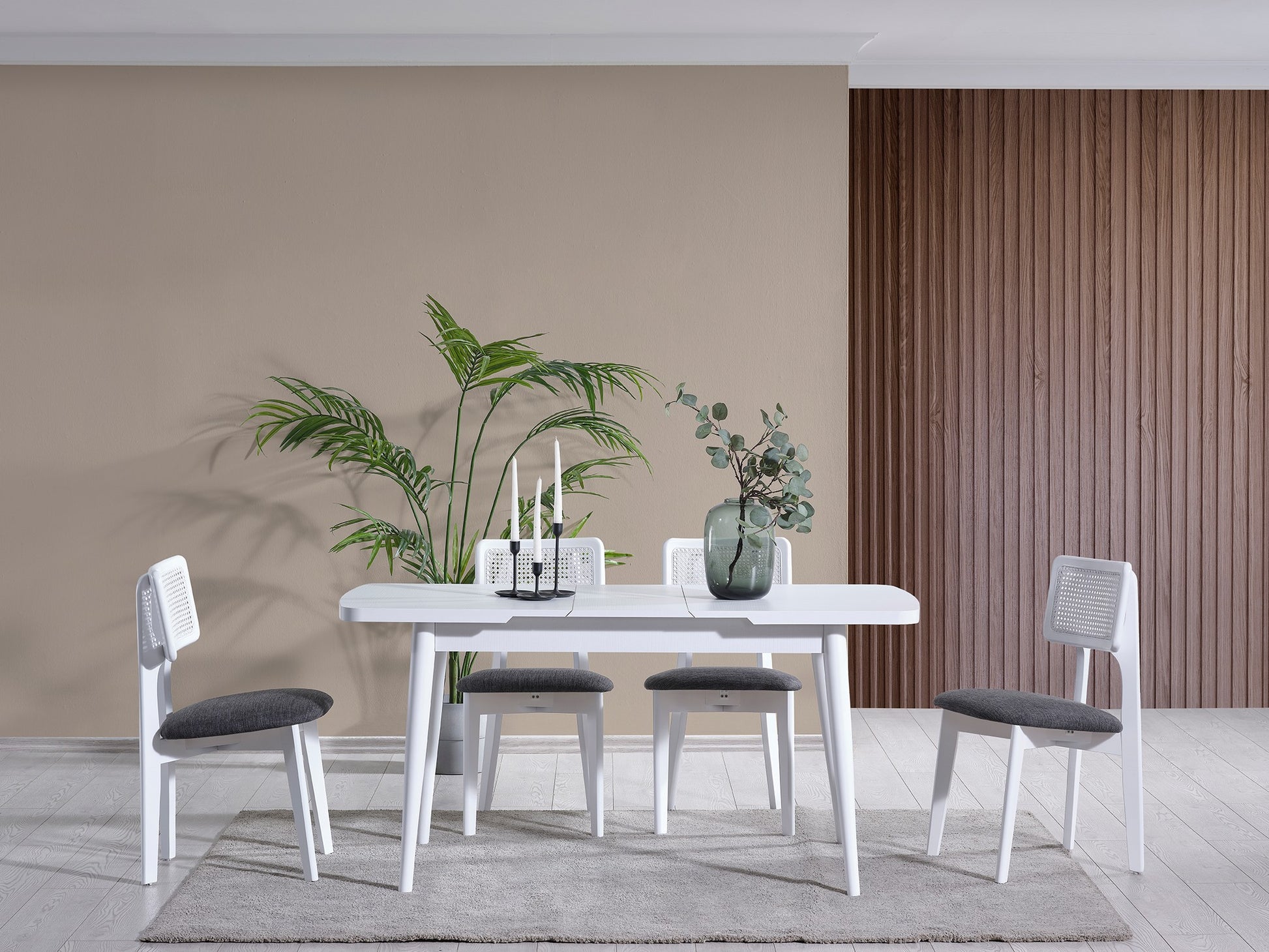 O design elegante da mesa dá um toque de modernidade ao seu espaço, enquanto a caraterística extensível permite-lhe acomodar mais convidados com facilidade. As cadeiras, com os seus assentos confortáveis e a elegante cor branca, complementam a mesa na perfeição, criando um visual coeso que impressionará os seus convidados.