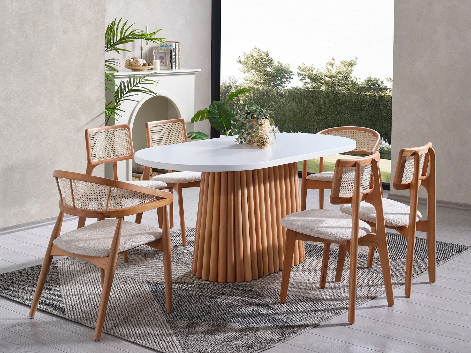 Conjunto de mesa de jantar e cadeiras – 6 peças – Branco e Natural – Madeira de faia