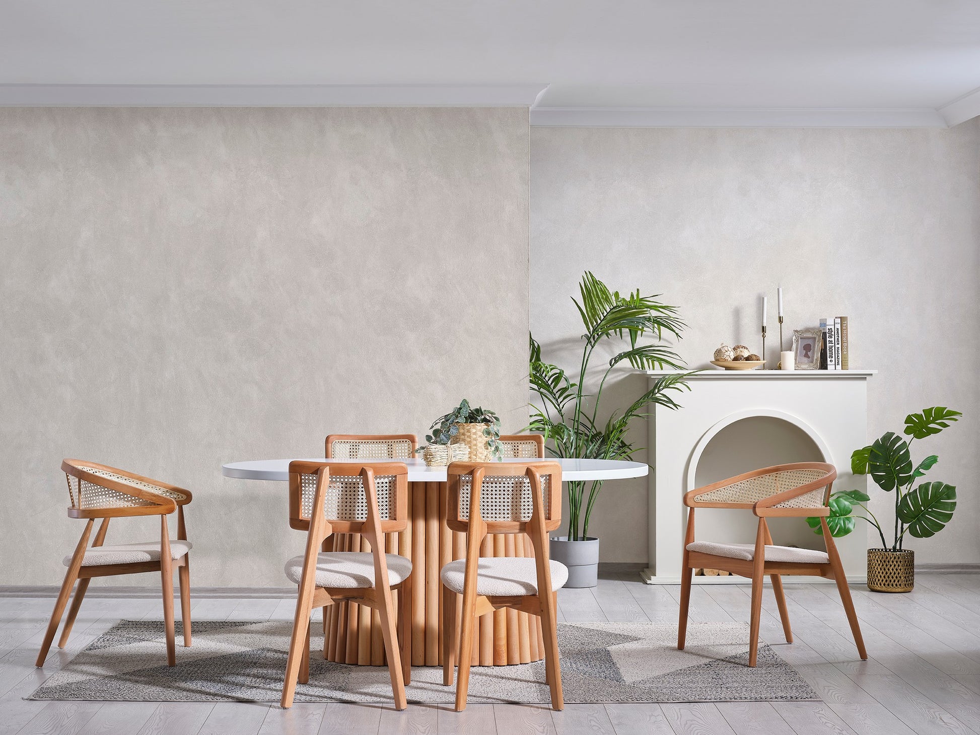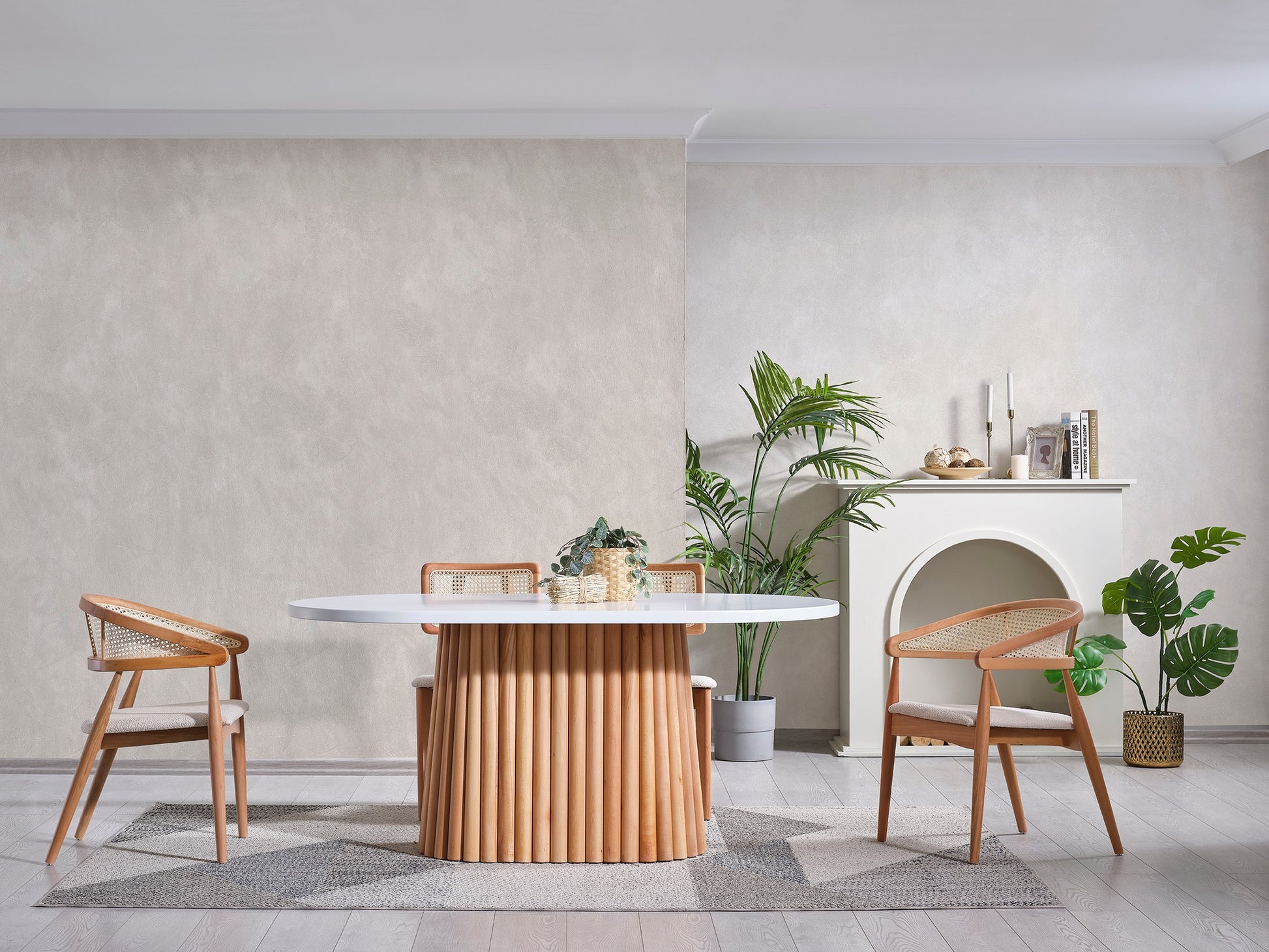 O design elegante e moderno deste conjunto de jantar irá atualizar instantaneamente a decoração da sua sala de jantar. A combinação de cores brancas e naturais acrescenta um toque de sofisticação, tornando-o uma adição versátil a qualquer casa.