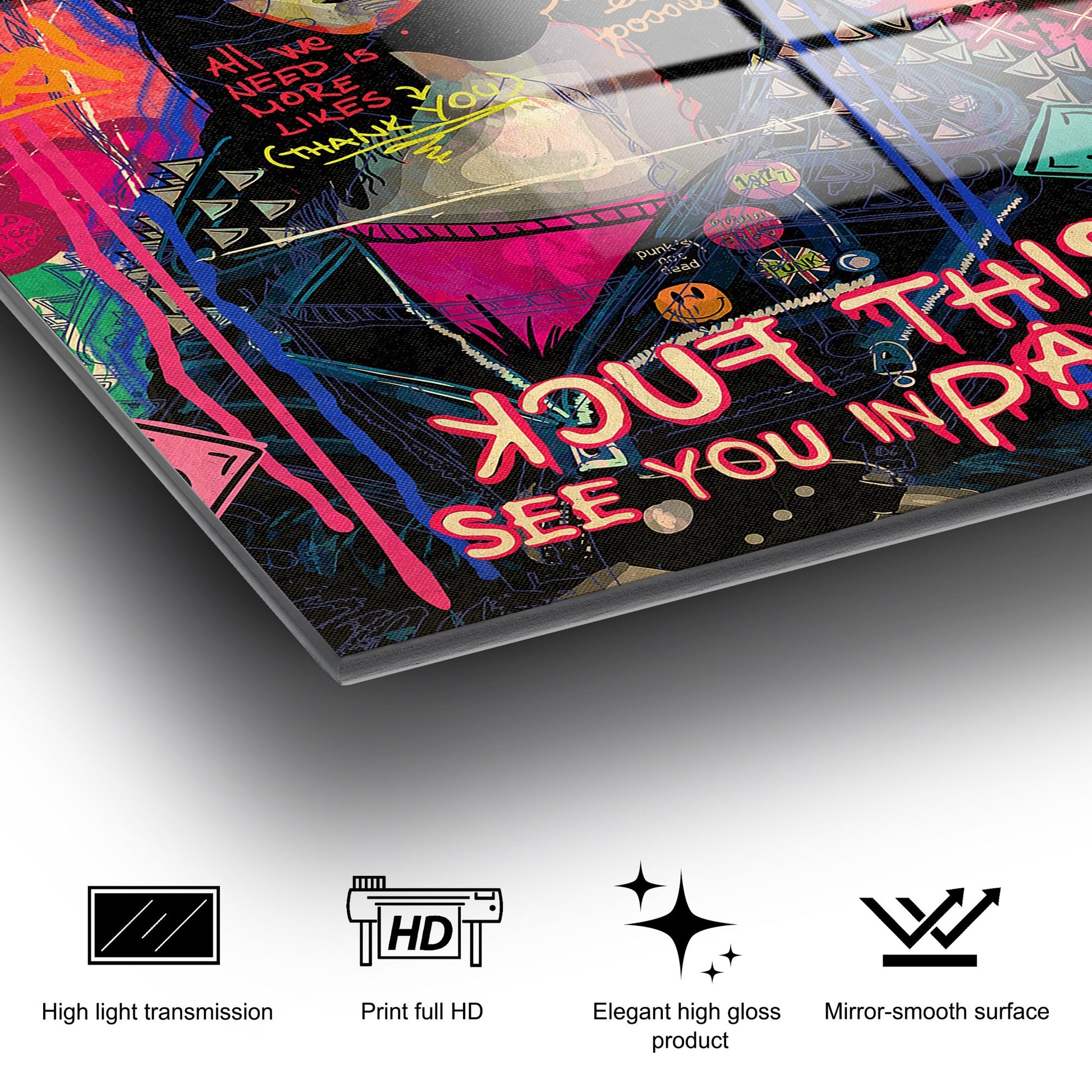 Este não é apenas um quadro decorativo - é uma declaração de estilo. O vidro temperado oferece uma luminosidade única que realça as cores multicolor, criando reflexos e jogos de luz que mudam ao longo do dia. Perfeito para salas de estar, escritórios, quartos ou qualquer espaço que mereça um toque de sofisticação.