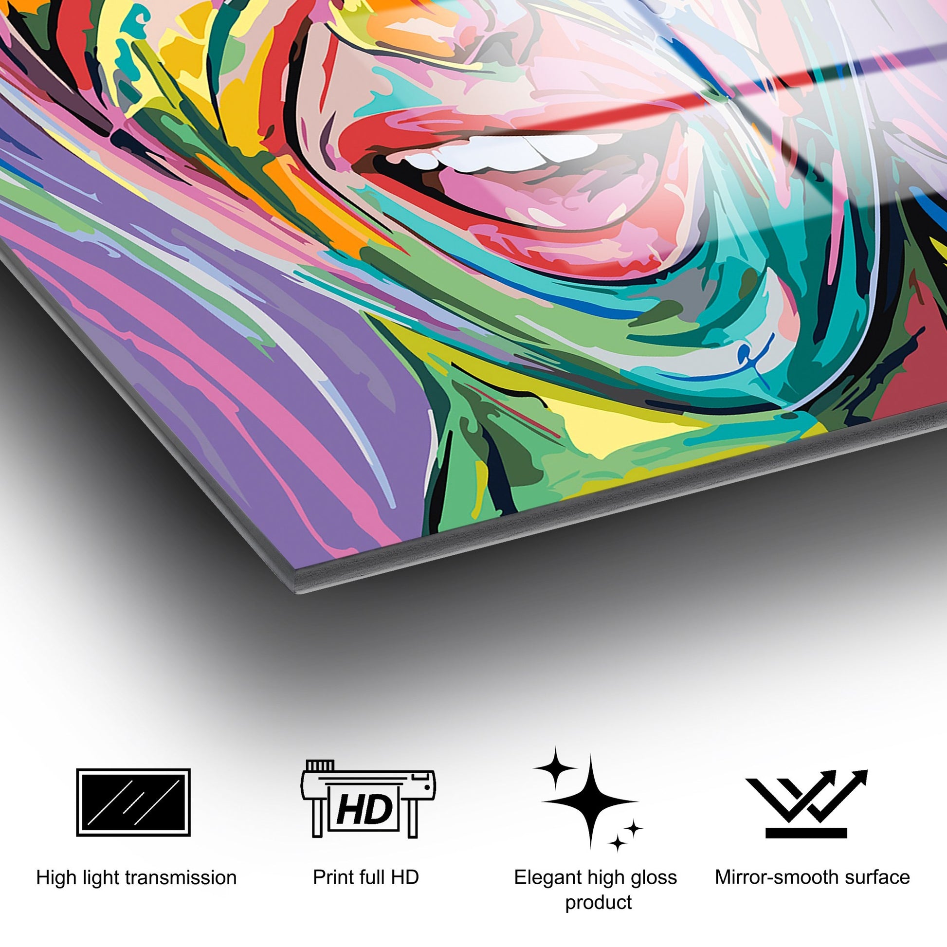 Este não é apenas um quadro decorativo - é uma declaração de estilo. O vidro temperado oferece uma luminosidade única que realça as cores multicolor, criando um efeito visual impressionante que muda conforme a luz do ambiente.