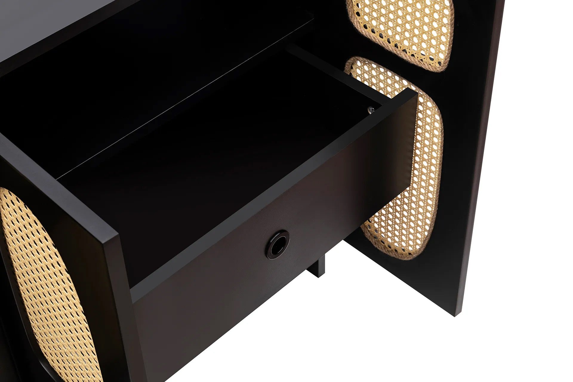 A consola apresenta-se numa cor preta impressionante, acrescentando um toque de drama e elegância a qualquer divisão. O seu design elegante e intemporal complementa sem esforço qualquer decoração existente, tornando-a uma peça versátil que pode ser perfeitamente integrada na sua casa.