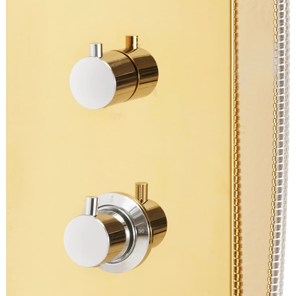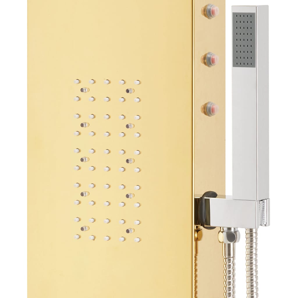 A coluna de duche é feita de um aço inoxidável durável com um acabamento em dourado espelhado e possui um bonito design curvo. Apresenta quatro funções: chuva, cascata, jatos de massagem e um chuveiro de mão, que pode ser facilmente selecionado através de um manípulo. As luzes LED podem ser ligadas ou desligadas, dependendo do seu estado de espirito. A temperatura da água é ajustável através do manípulo do termostato.