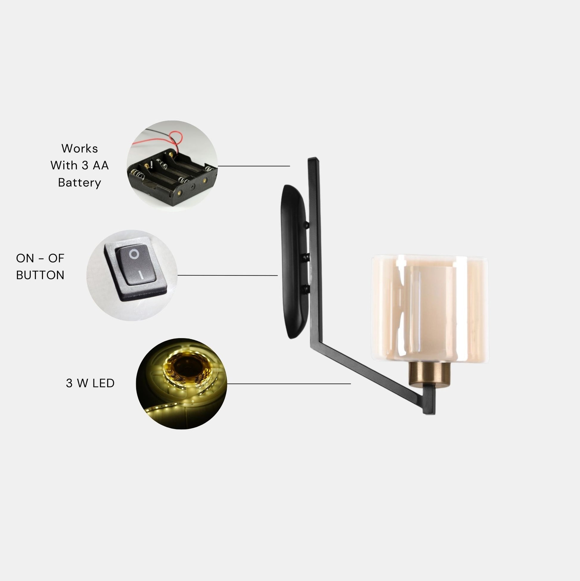 Fabricado com um corpo metálico robusto e um casquilho de vidro, este candeeiro de parede foi concebido para durar. O casquilho de led de 3,15 w fornece uma iluminação brilhante e eficiente em termos energéticos, enquanto a opção de utilizar 3 pilhas aa oferece flexibilidade na alimentação do candeeiro.