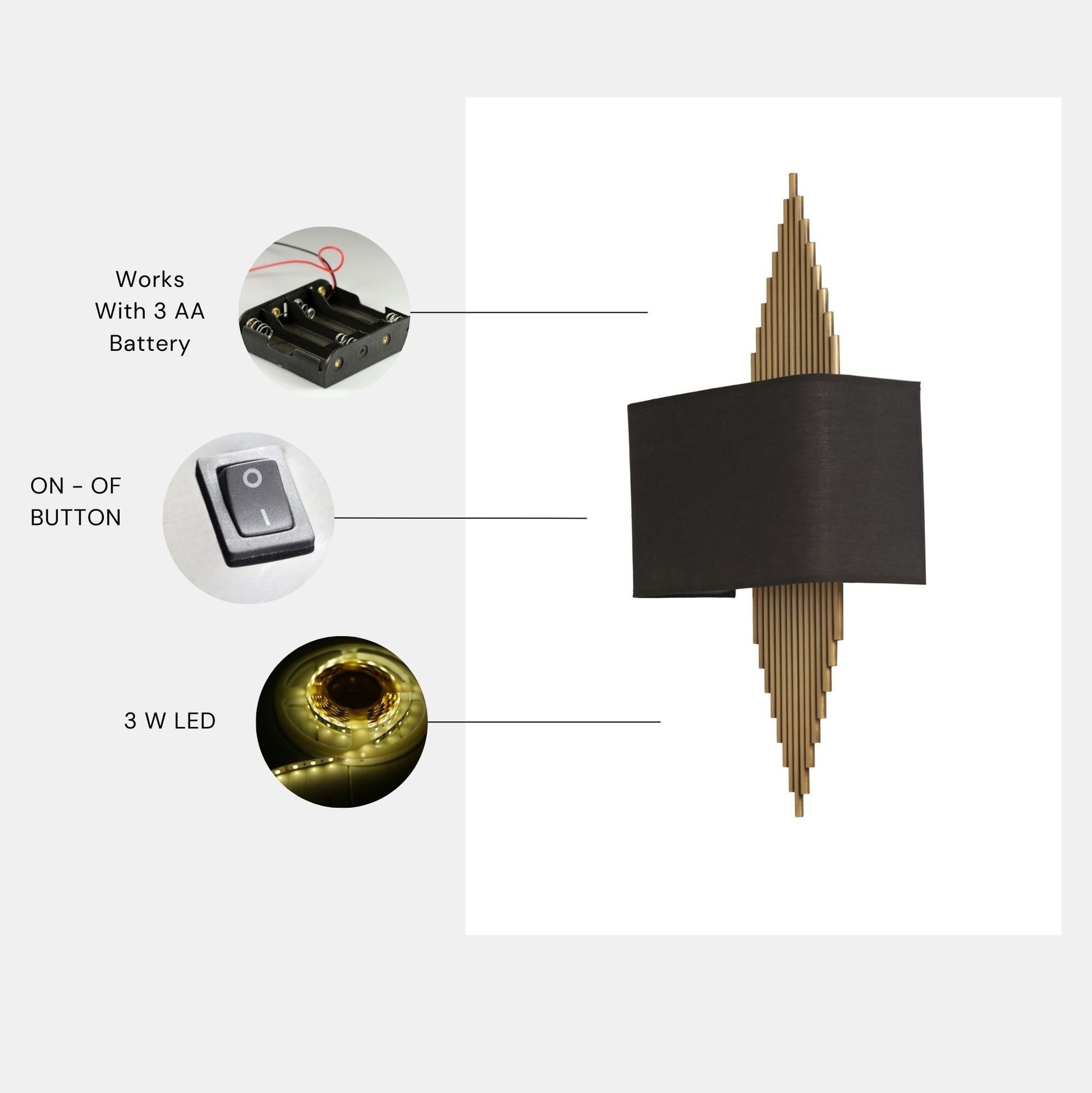 O botão de ligar/desligar no corpo permite uma operação fácil, enquanto a opção de alimentar a lâmpada com 3 pilhas aa dá-lhe a flexibilidade de a colocar onde quiser sem se preocupar com fios inestéticos.