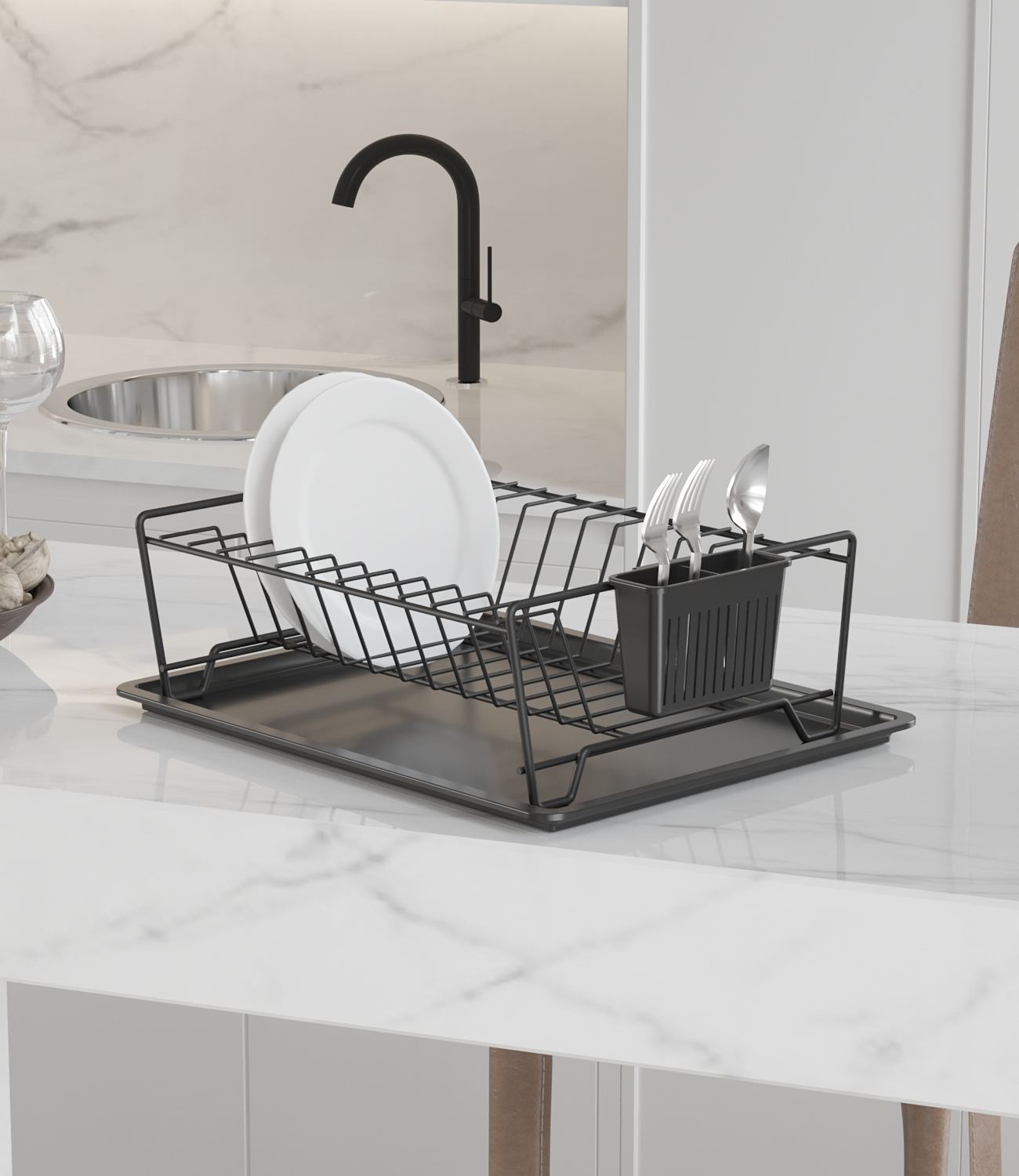 Com 35,5 x 29,5 x 11 cm, este suporte para pratos oferece um espaço amplo para os seus pratos, copos e talheres. Os seus compartimentos e ranhuras inteligentemente concebidos permitem uma secagem e organização eficientes, assegurando que a sua cozinha permanece livre de desordem. Diga adeus às bancadas desarrumadas e olá a uma cozinha bem organizada!