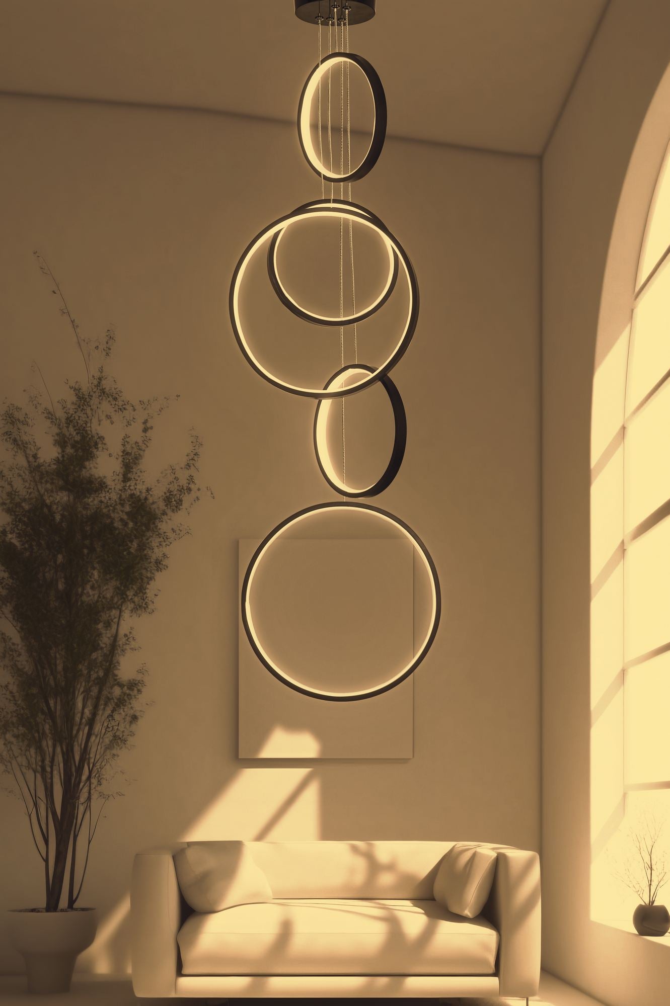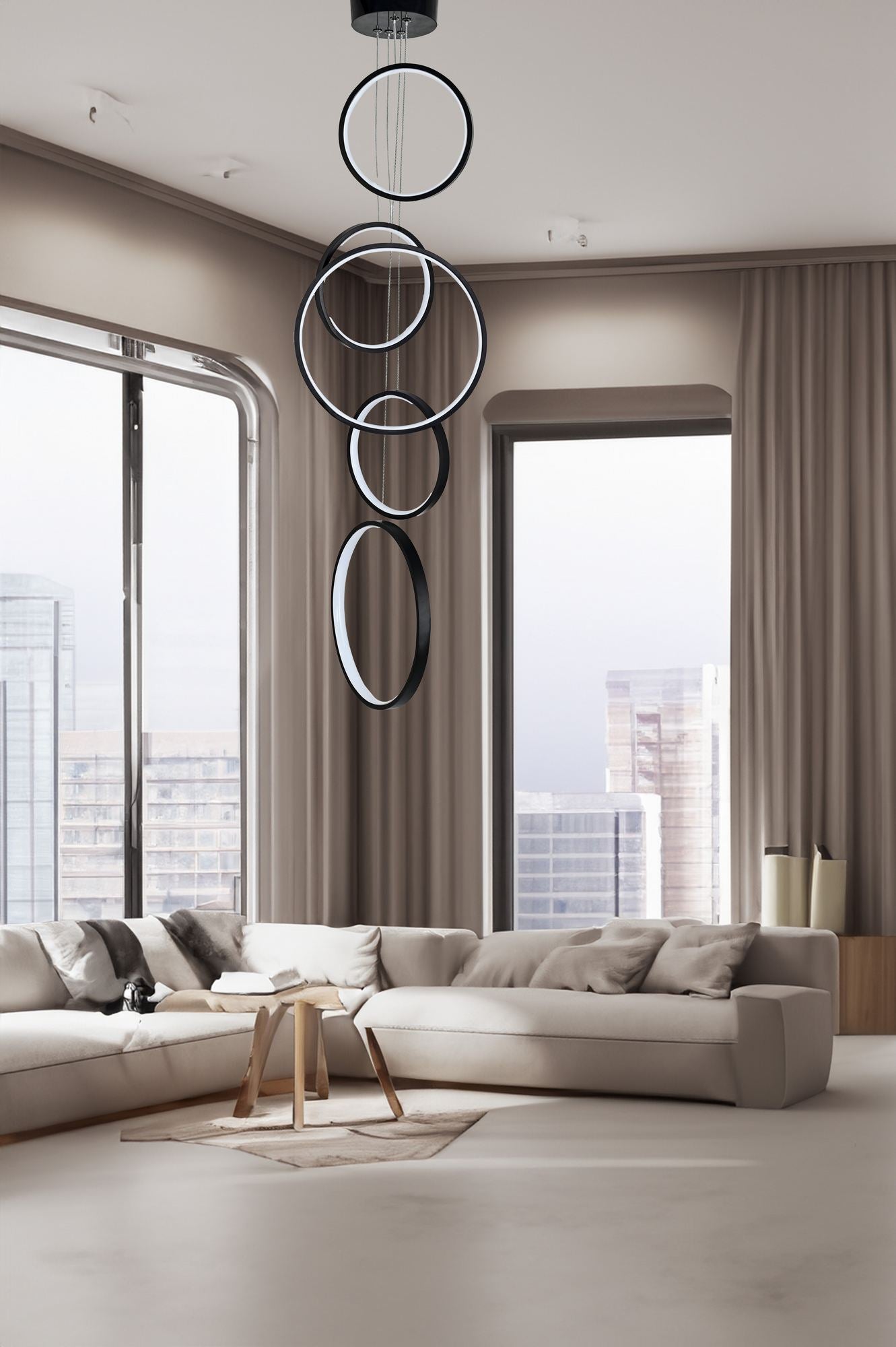 Transforme seu espaço de vida com nosso deslumbrante lustre de CORPO DE ALUMÍNIO. Esta peça requintada apresenta três anéis com diâmetro de 20 cm e dois anéis com diâmetro de 30 cm, criando um efeito visual cativante que deixará seus convidados maravilhados. A altura ajustável permite que você personalize o visual para se adequar perfeitamente ao seu espaço, enquanto as lâmpadas LED de luz amarela emitem um brilho quente e acolhedor.
