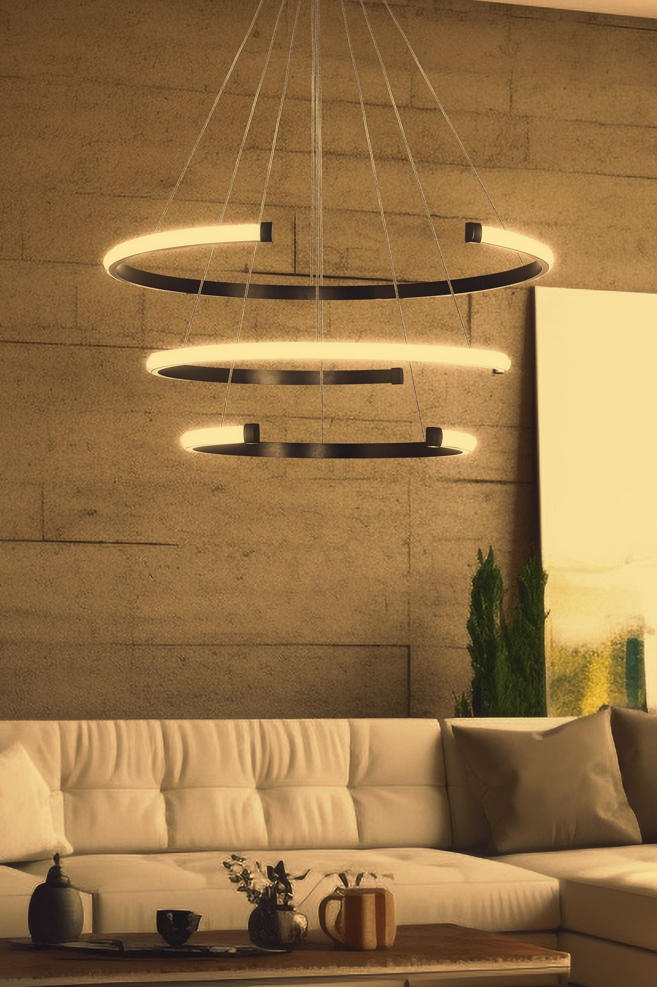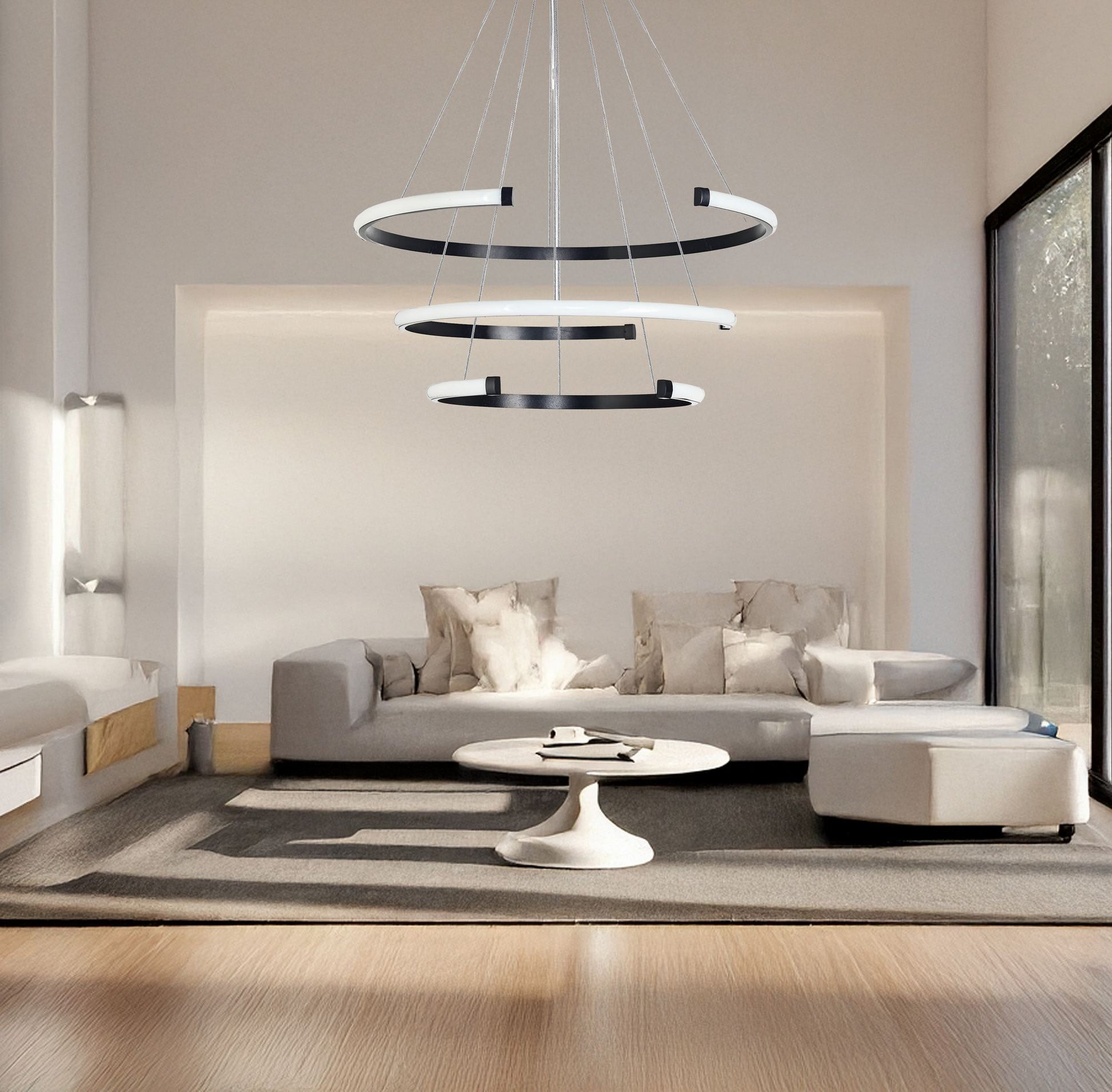 Ilumine sua casa com elegância e estilo com nosso deslumbrante lustre de CORPO DE ALUMÍNIO. Esta peça requintada apresenta três anéis com diâmetros de 30, 40 e 50 cm, criando um efeito visual cativante que deixará seus convidados maravilhados. A altura ajustável permite que você personalize o visual para se adequar perfeitamente ao seu espaço, enquanto as lâmpadas LED de luz amarela emitem um brilho quente e acolhedor.