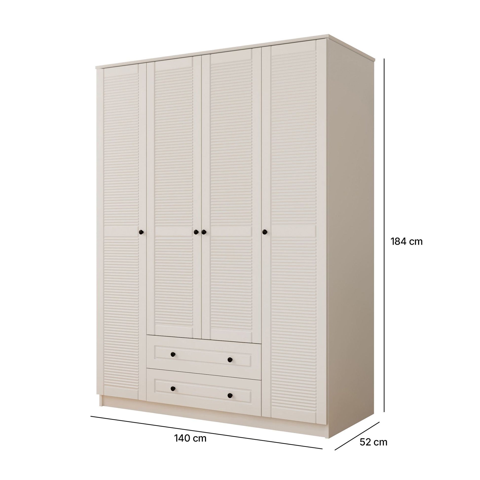 Medindo 140cm de largura, 184cm de altura e 52cm de profundidade, este guarda-roupa oferece muito espaço de armazenamento sem ocupar muito espaço. Além disso, pode ser facilmente fixado à parede para maior estabilidade.