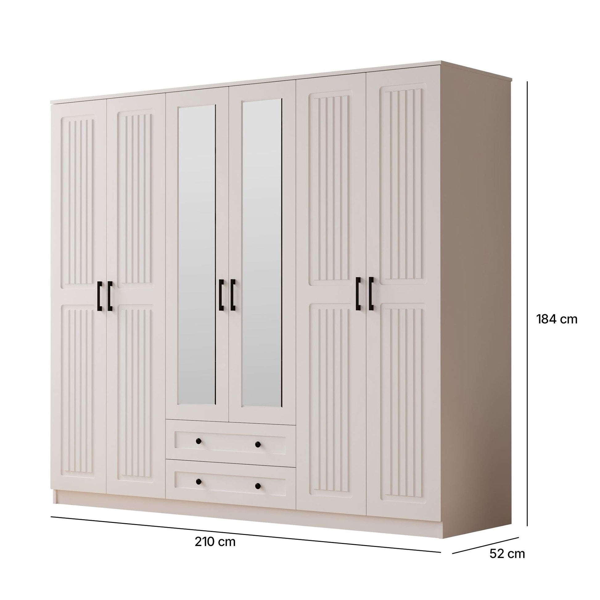 Com dimensões de 210cm de largura, 184cm de altura e 52cm de profundidade, este guarda-roupa oferece muito espaço para todos os seus pertences. E com a opção de fixá-lo na parede, você pode personalizar seu espaço de acordo com suas necessidades.