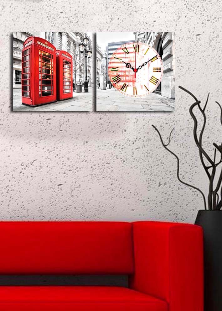 Relógio de Parede em Tela Suede Multicolor – 2 Peças (28x28 cm cada, total 60x28) com Moldura de Madeira