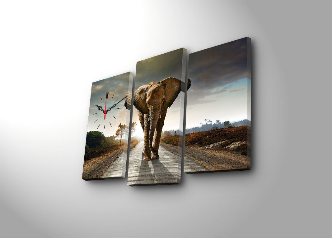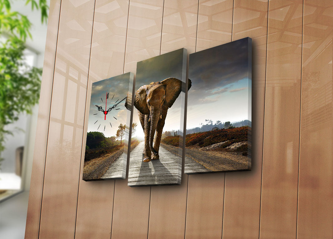 Relógio de Parede em Tela Decorativa (3 Peças), Multicolor – Suede 100%, Moldura de Madeira 3 cm, Tamanho Total 66x45 cm