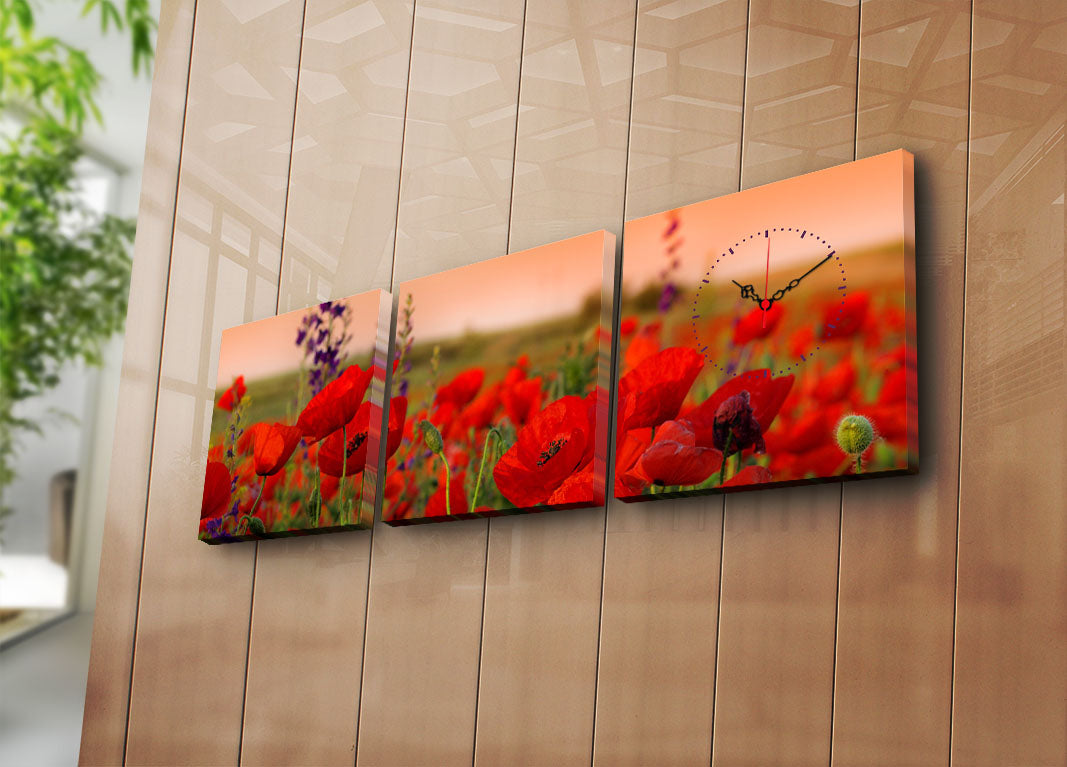Relógio de Parede em Tela Suede 100% – Conjunto 3 Peças Multicolor, 28x28 cm (cada), Total 90x28 cm, Moldura de Madeira 3 cm – 3P2828CS-11