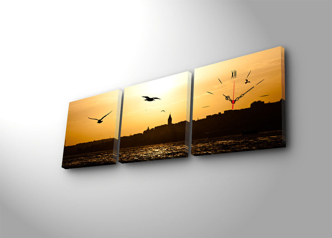 Relógio de Parede em Tela Decorativa (3 Peças) Multicolor – Suede 100% com Moldura de Madeira 3 cm (28x28 cm cada, 90x28 cm total)