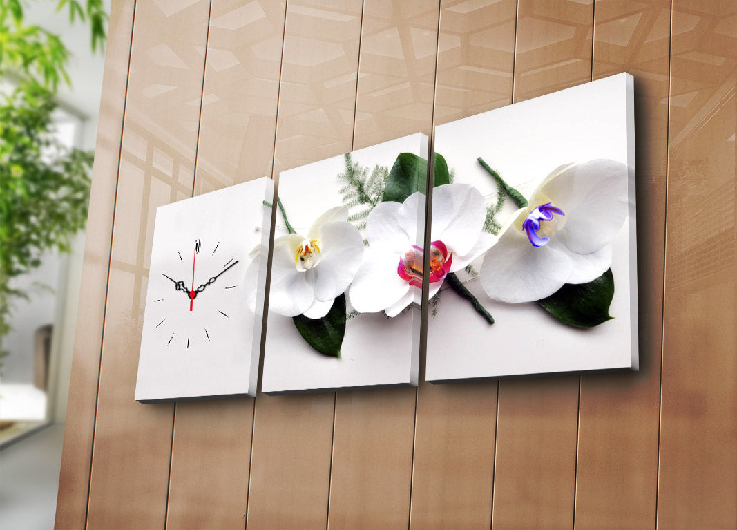Relógio de Parede em Tela Decorativa Multicolor (3 Peças) – 30x40 cm cada, Total 96x40 cm, Tela de Camurça 100%, Moldura de Madeira 3 cm – 3P3040CS-13