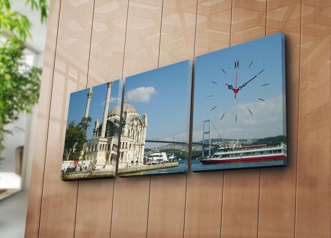 Relógio de Parede em Tela Decorativa (3 Peças) Multicolor – 30x40 cm cada, Total 96x40 cm, Tela Suede 100%, Moldura de Madeira 3 cm – 3P3040CS-24