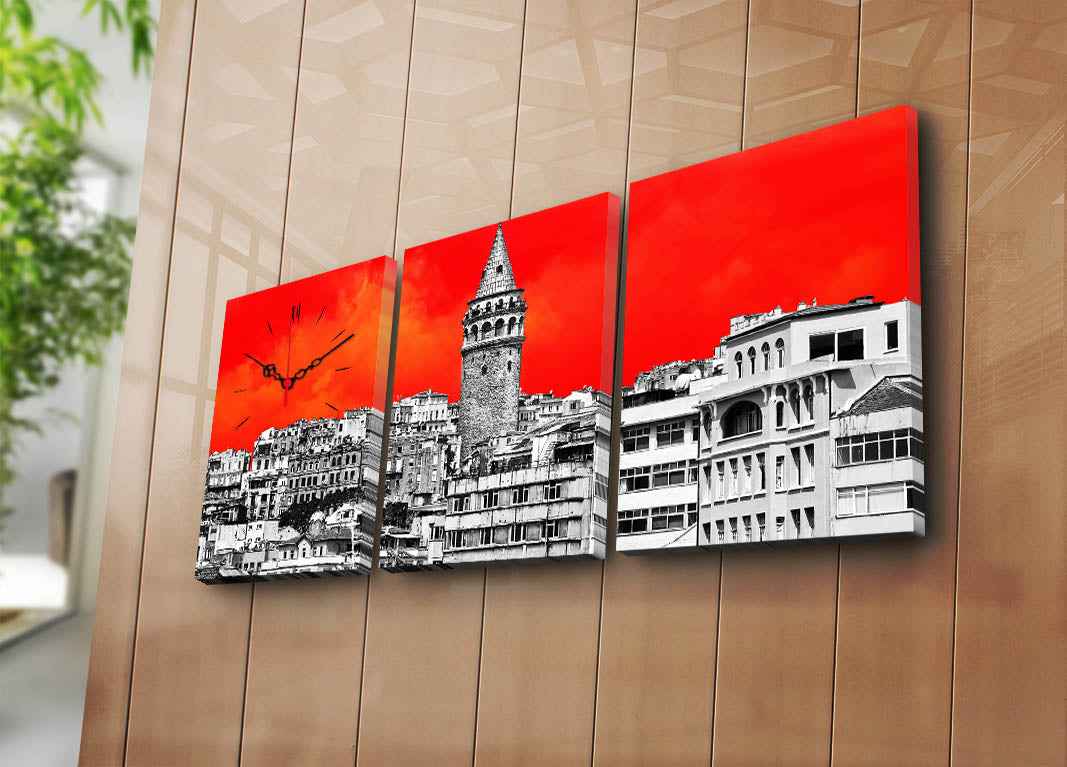 Relógio de Parede em Tela Decorativa (Conjunto 3 Peças) Multicolor – Tela Camurça 100%, Moldura de Madeira 3 cm, 96x40 cm