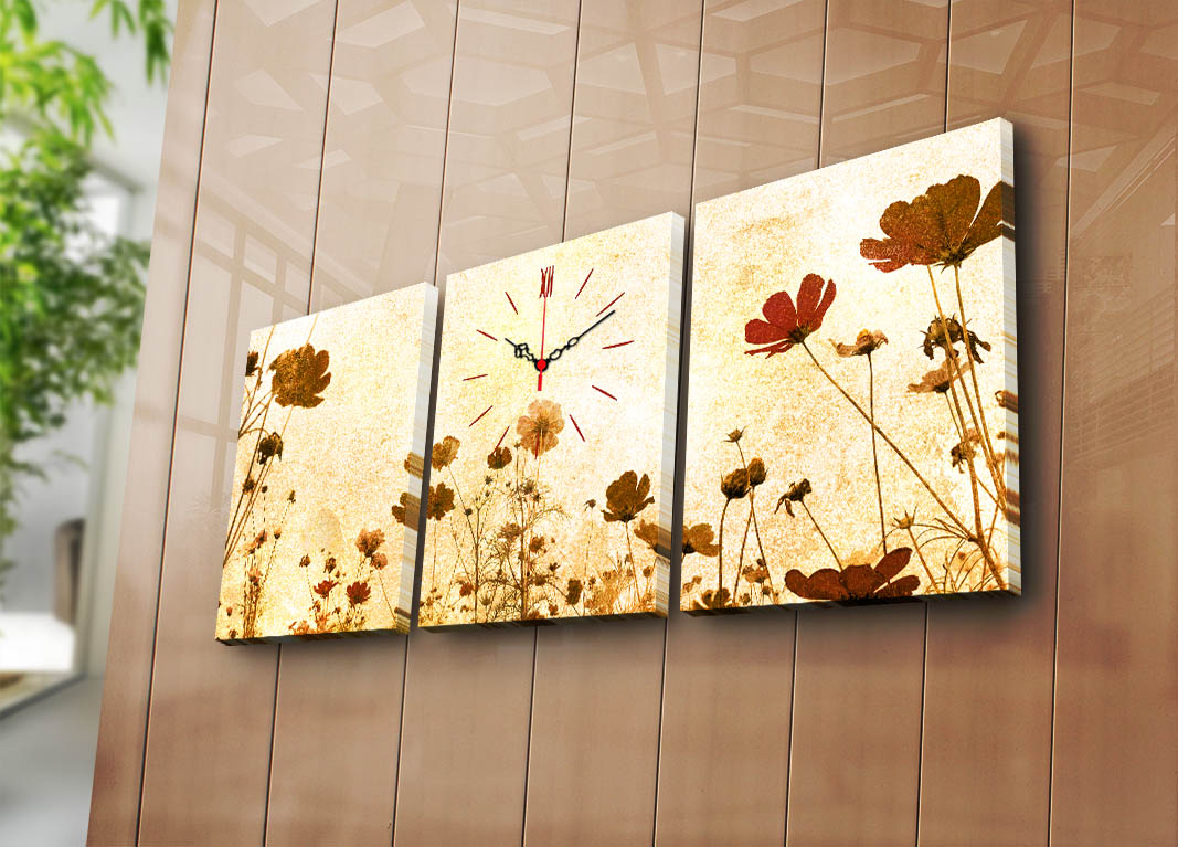 Relógio de Parede em Tela Suede – Conjunto 3 Peças, Multicolor, Moldura de Madeira, 30x40 cm (cada), Total 96x40 cm