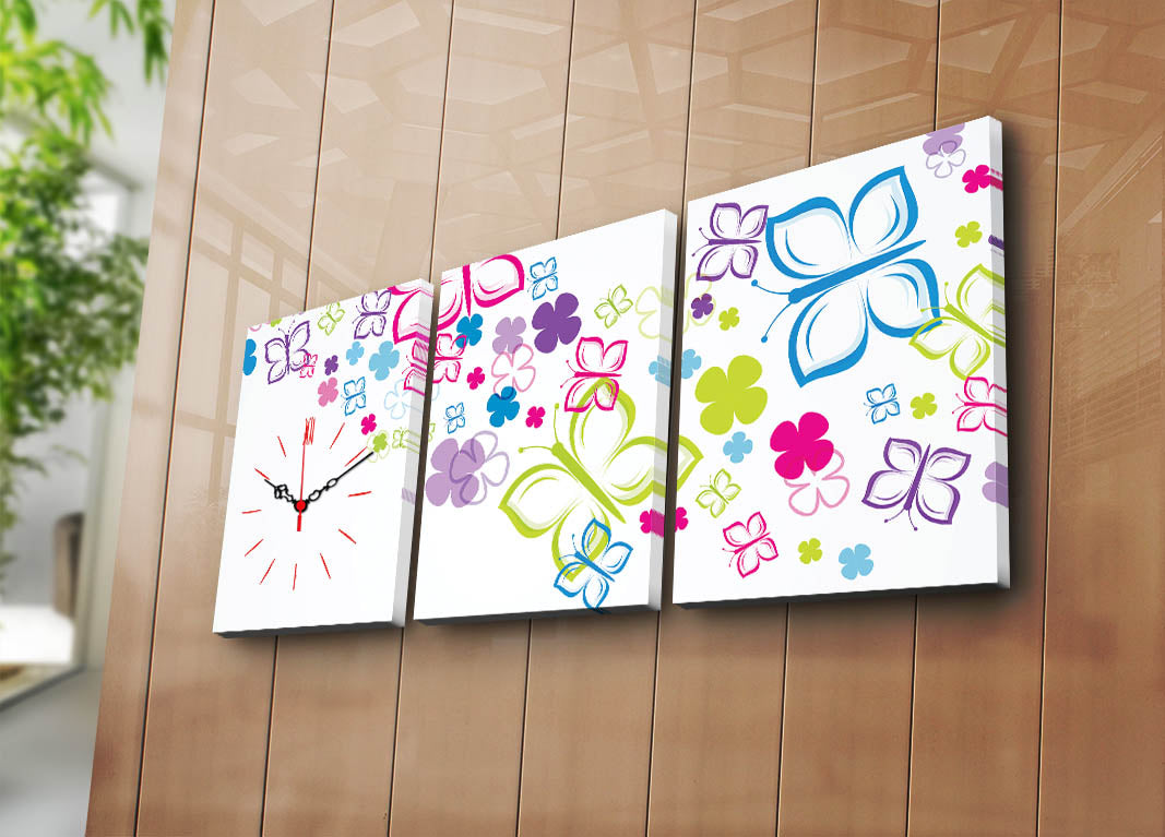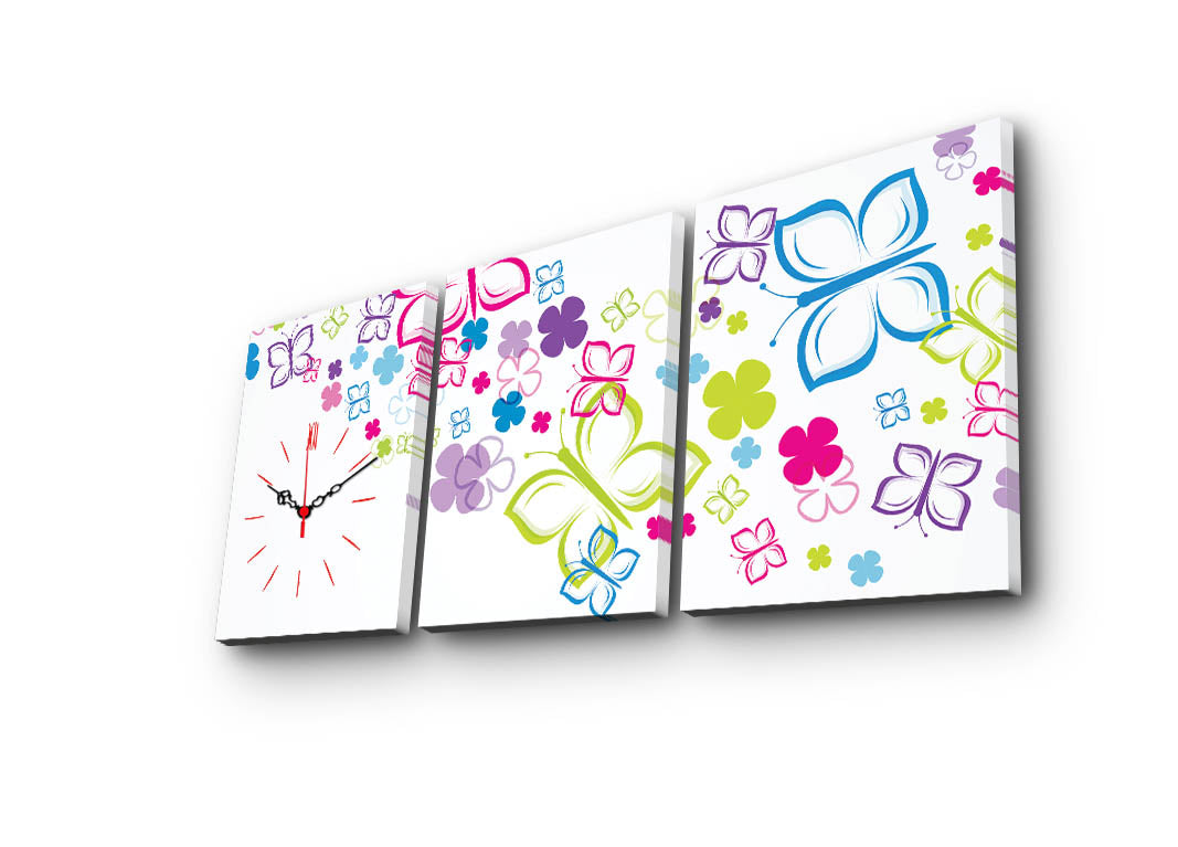 Relógio de Parede em Tela Decorativa (3 Peças) Multicolor — Tela Suede 100%, 30x40 cm cada, Total 96x40 cm, Moldura de Madeira 3 cm (3P3040CS-65)