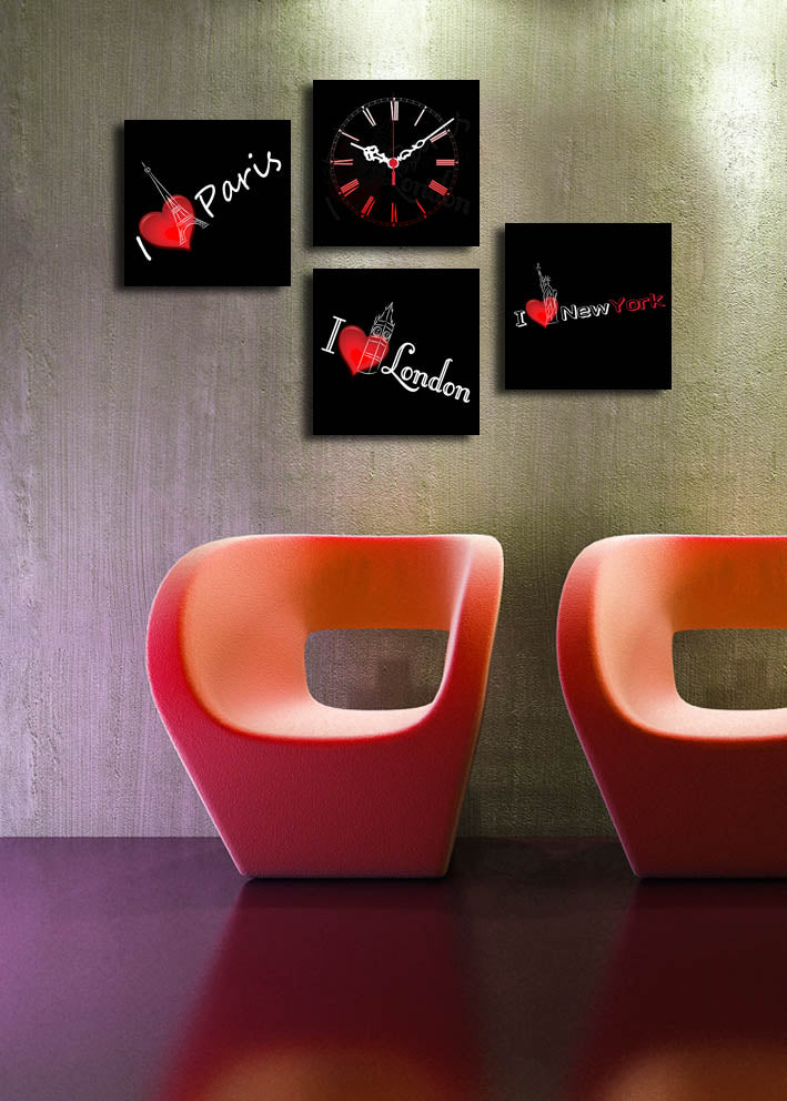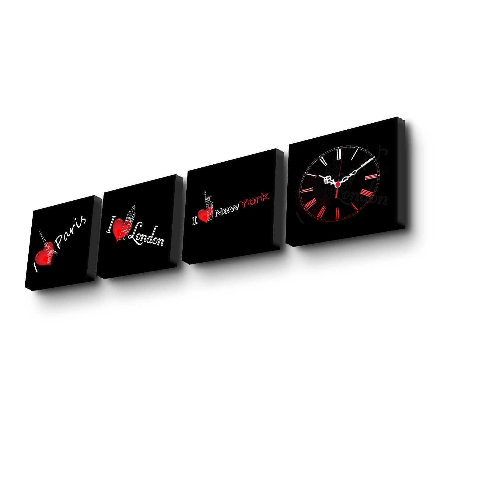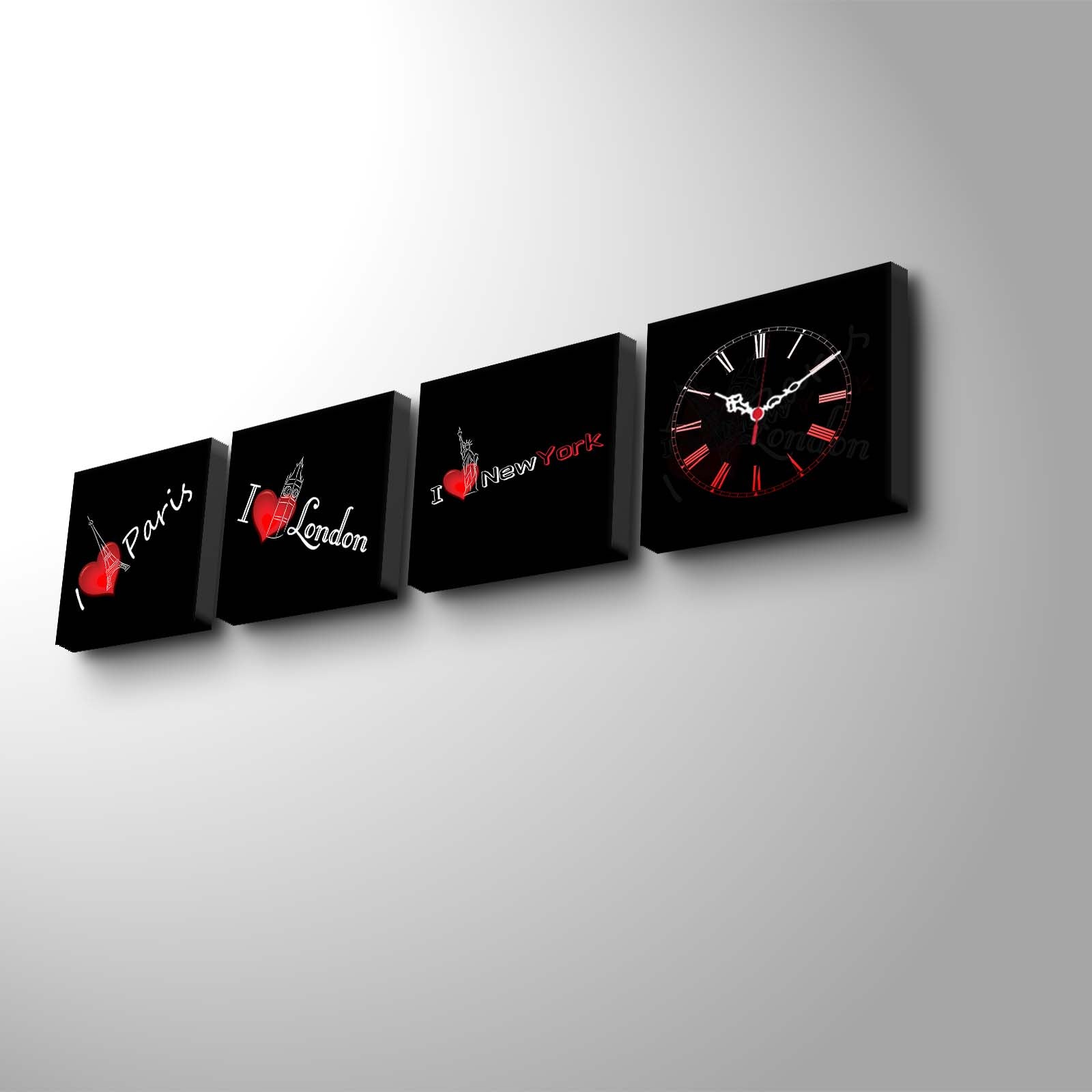 Relógio de Parede em Tela Decorativa 4 Peças, Multicolor — 4P1919CS-3, Tela Suede 100%, Moldura de Madeira 3 cm (19x19 cm cada, 42x63 cm total)