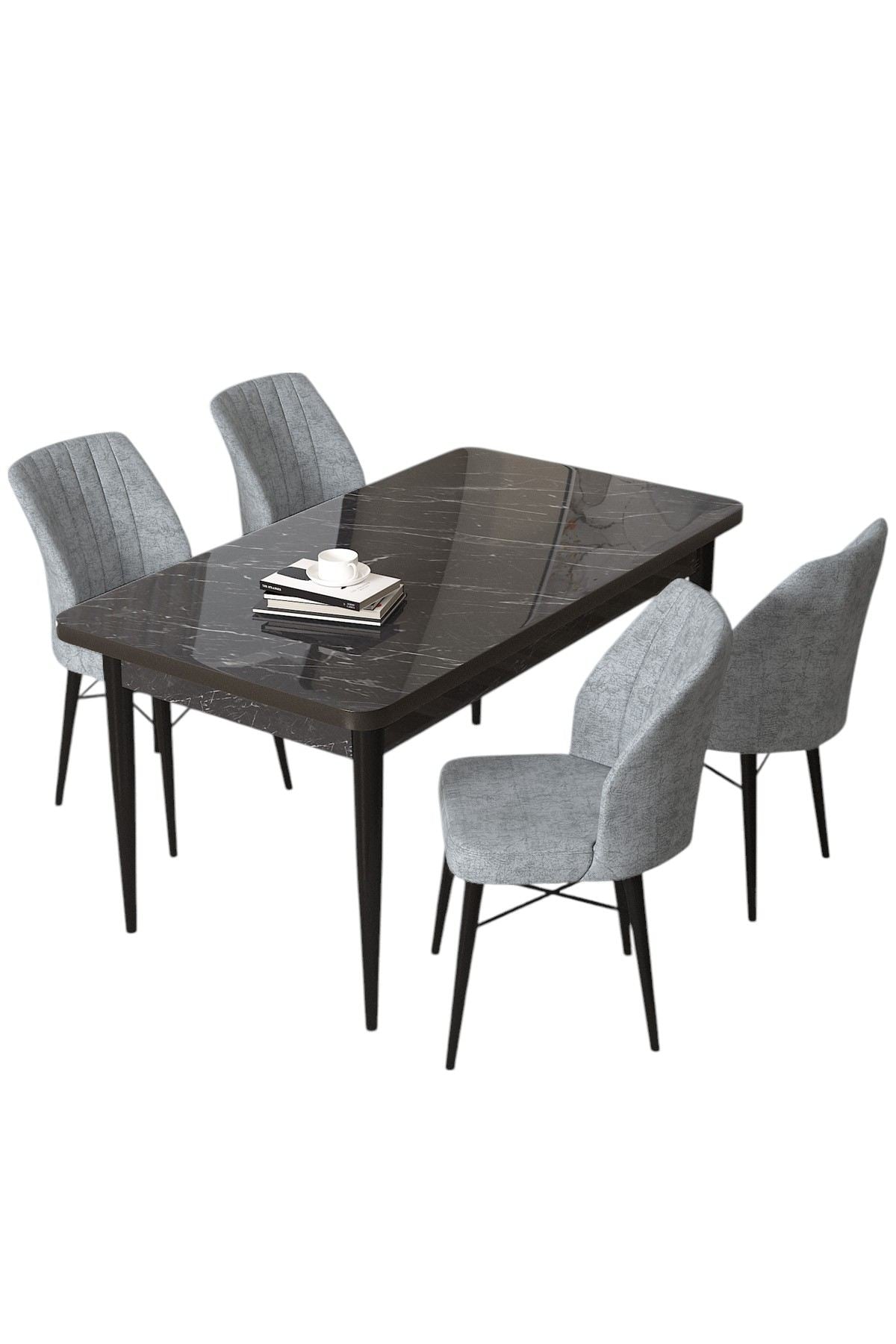 O conjunto vem em uma deslumbrante combinação de cores em mármore preto e cinza, adicionando um toque de sofisticação à sua área de jantar. Seja para receber um jantar ou desfrutar de uma refeição casual com seus entes queridos, este conjunto elevará sua experiência de jantar.