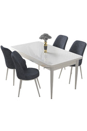As pernas de metal elegantes e o tampo da mesa em aglomerado revestido com 100% de melamina exalam sofisticação moderna, enquanto as cadeiras de tecido Jerry adicionam um toque de luxo à sua área de jantar. A combinação das cores branca e fumaça cria um visual chique e contemporâneo que impressionará seus convidados.