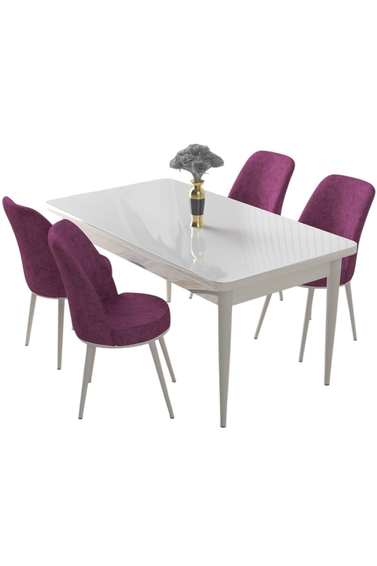 O conjunto apresenta um esquema de cores chique em branco e roxo, adicionando um toque de cor e sofisticação à sua área de jantar. Seja para um jantar formal ou uma refeição casual com sua família, este conjunto elevará sua experiência de jantar.
