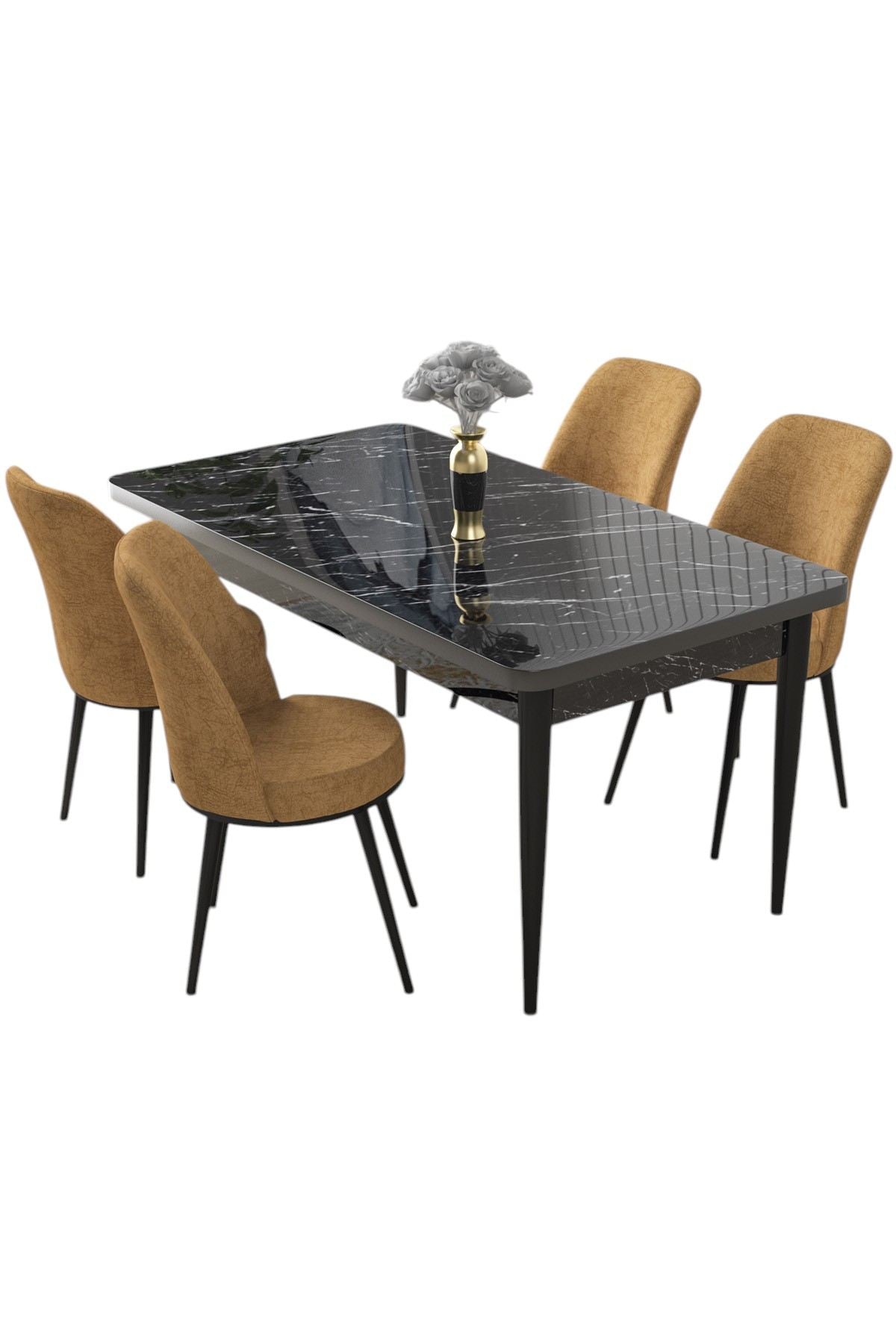 Conjunto de mesa de jantar e cadeiras (5 peças) – 110 cm x 76 cm x 71 cm – Mármore Preto e Cappuccino – Aglomerado e Metal
