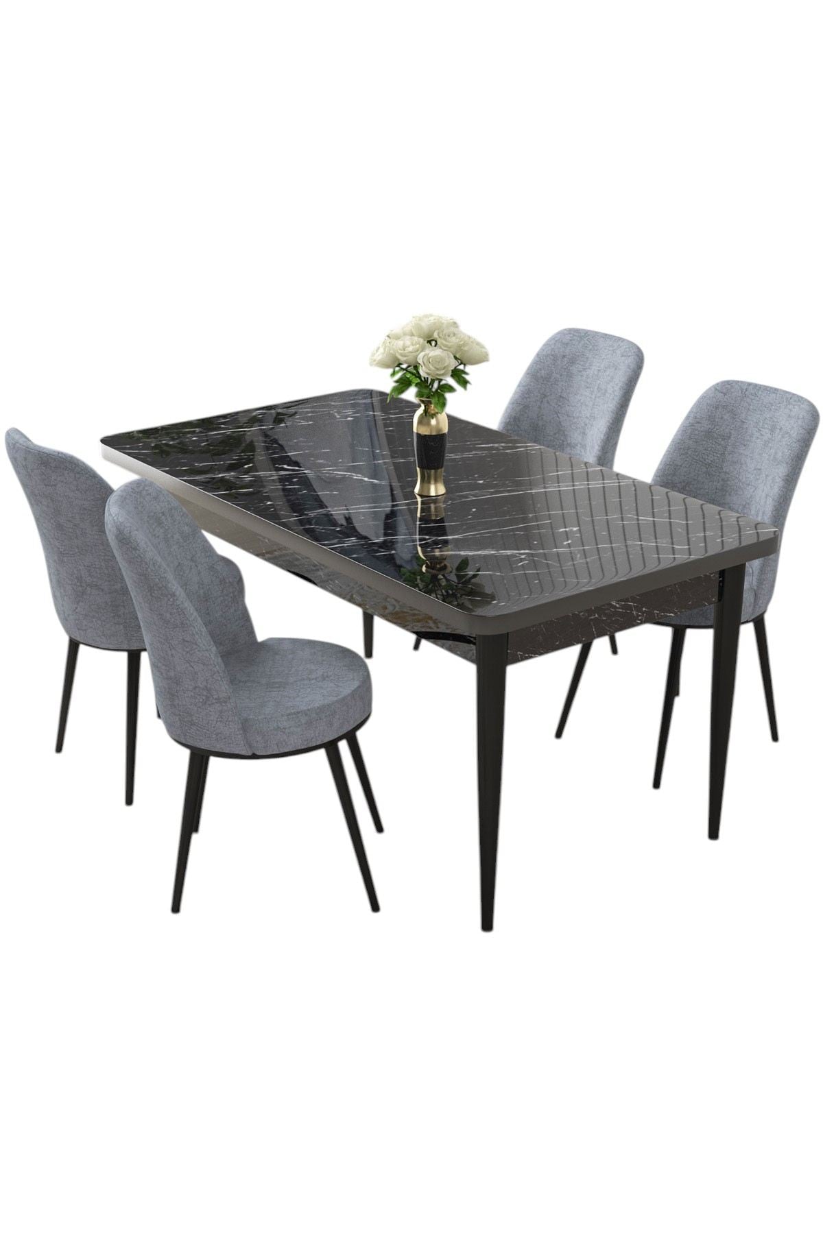 - Cor: Tampão de mesa de mármore preto com cadeiras cinzas