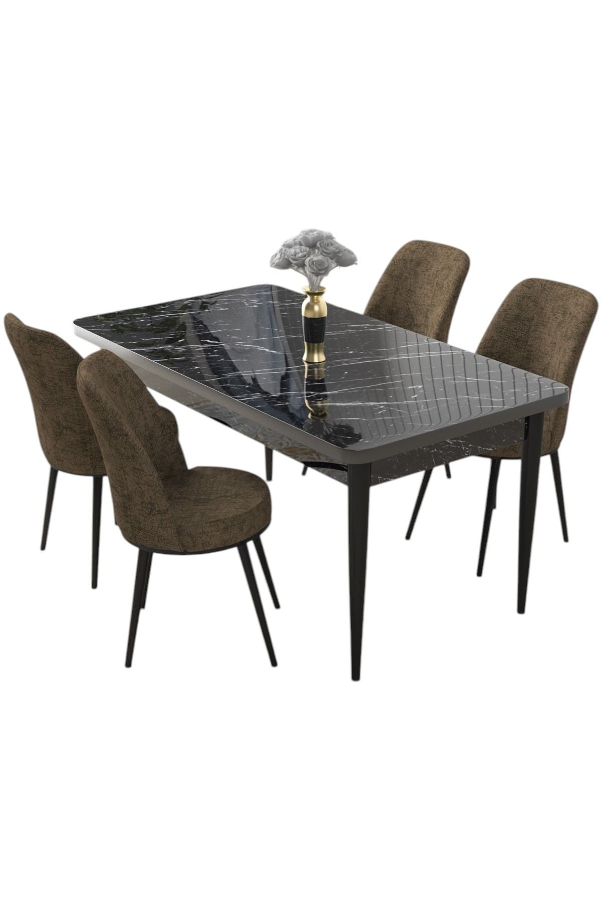 Conjunto de mesa de jantar e cadeiras (5 peças) – 110 cm x 76 cm x 71 cm – Mármore Preto e Marrom – Aglomerado e Metal
