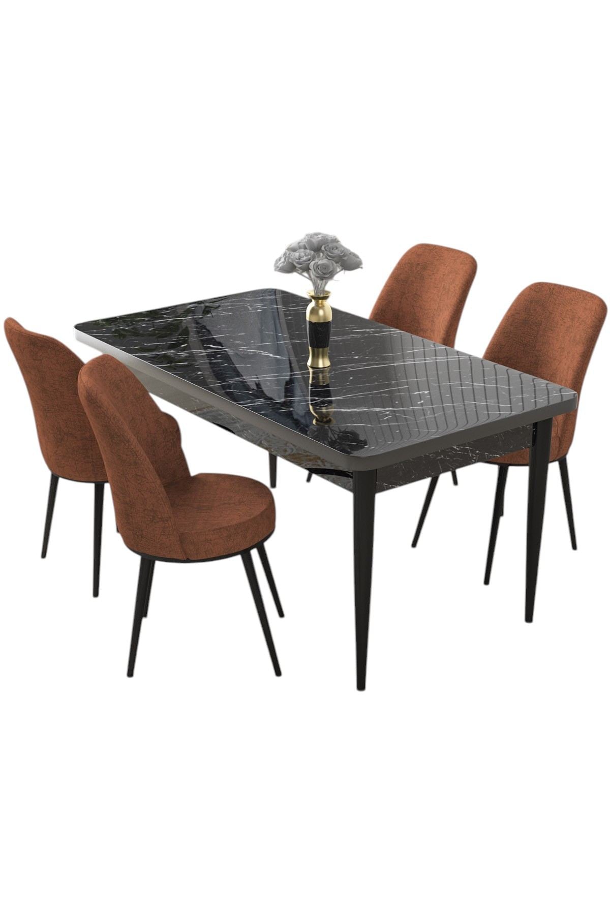 A mesa de jantar de mármore preto elegante, combinada com cadeiras vermelhas vibrantes, elevará instantaneamente a aparência da sua área de jantar. As pernas de metal proporcionam estabilidade e suporte, garantindo que este conjunto dure por muitos anos.