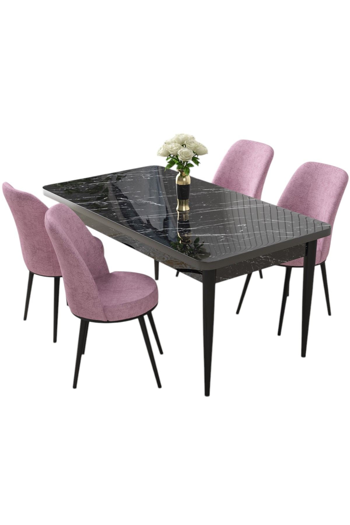 A mesa de jantar de mármore preto elegante, combinada com cadeiras rosa chiques, cria um contraste visual impressionante que chamará a atenção dos seus convidados instantaneamente. As pernas de metal proporcionam estabilidade e suporte, garantindo que este conjunto dure por muitos anos.